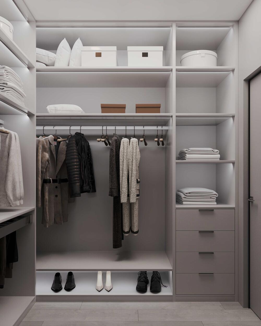 Скрытая гардеробная в зоне прихожей — одно из самых практичных решений в этом проекте. За лаконичными дверями находится полноценное пространство хранения, где предусмотрено всё необходимое для организации верхней одежды, обуви и сезонных вещей. Интерьер гардеробной выполнен в светло-серой гамме, перекликающейся с общим стилем квартиры.