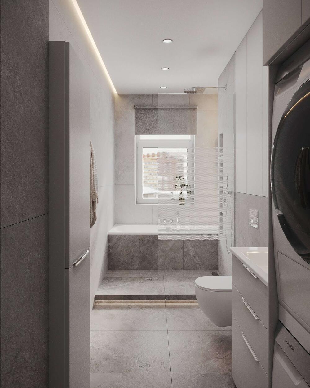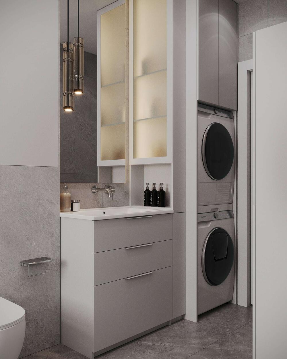Вдоль стены — зона постирочной, где в шкаф-колонну встроены стиральная и сушильная машины. Над ними предусмотрены закрытые шкафы для хранения бытовой химии, белья и принадлежностей. Умывальник с лаконичной тумбой дополнен высоким зеркалом и двумя вертикальными подвесными светильниками, создающими мягкий рассеянный свет. Отделка выполнена в оттенках натурального камня — сочетание светло-серых и графитовых плит с выразительной фактурой.