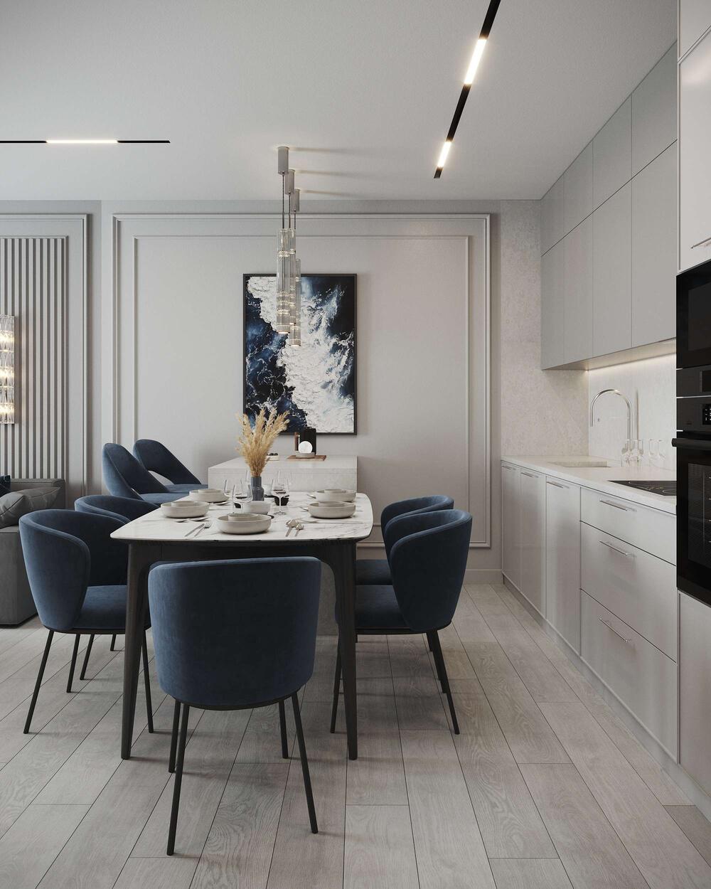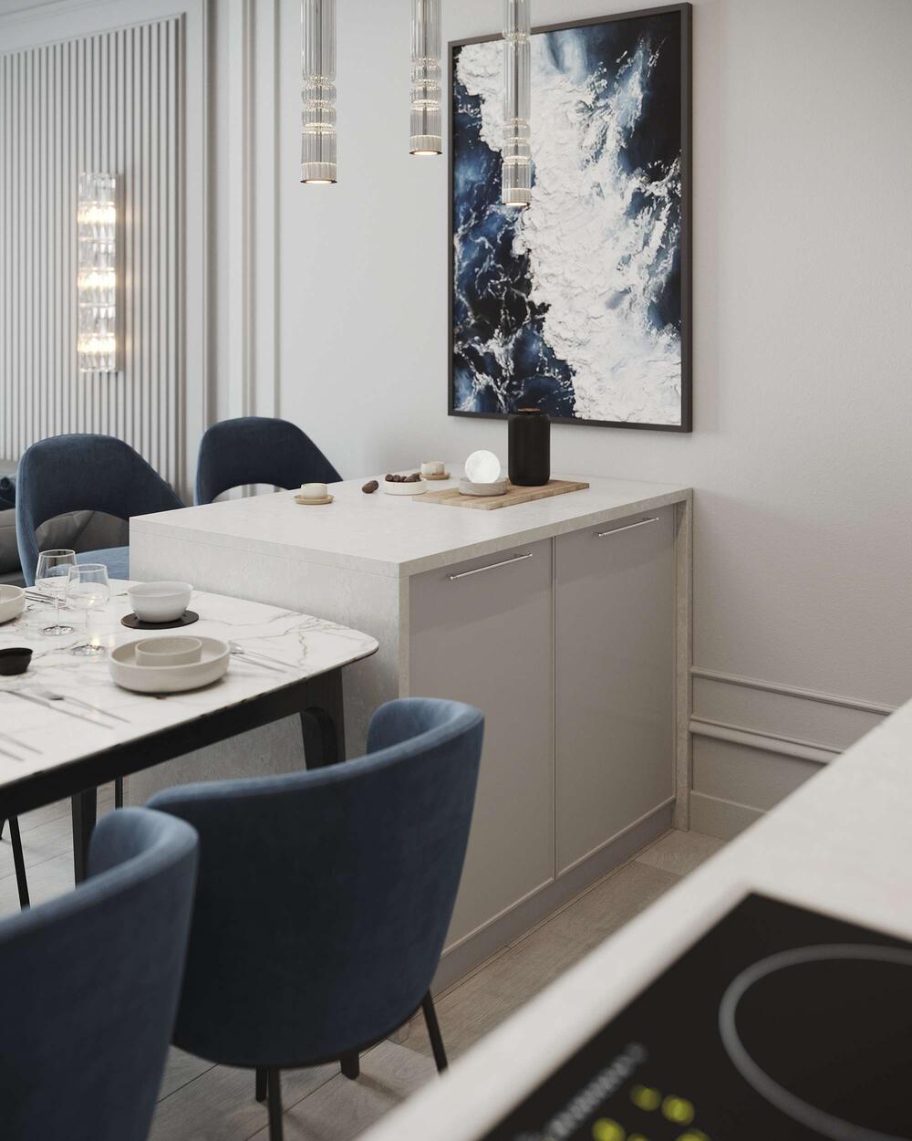 Центром композиции стал остров с барной стойкой, который одновременно служит и рабочей зоной, и связующим элементом между кухней и гостиной. Его столешница выполнена под белый мрамор с мягким серым прожилом — практичное и визуально лёгкое решение. Обеденная зона плавно продолжает кухню: здесь расположен большой стол с закруглёнными углами и бархатистыми синими стульями.