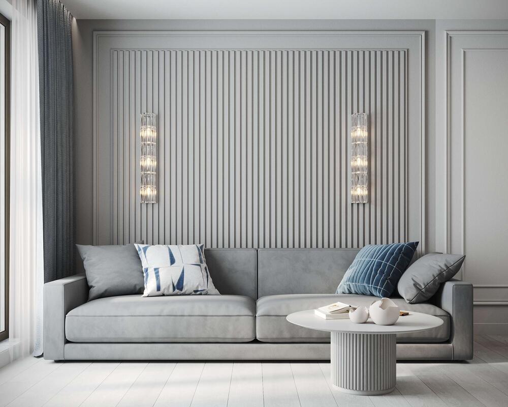 Центральная стена за диваном выделена вертикальными рейками и тонкими классическими молдингами. ТВ-зона оформлена панелями с декоративной штукатуркой под серебристый металл. Тумба под телевизором выполнена в едином стиле с остальной мебелью квартиры: лаконичные фасады, минимализм, встроенная подсветка.
