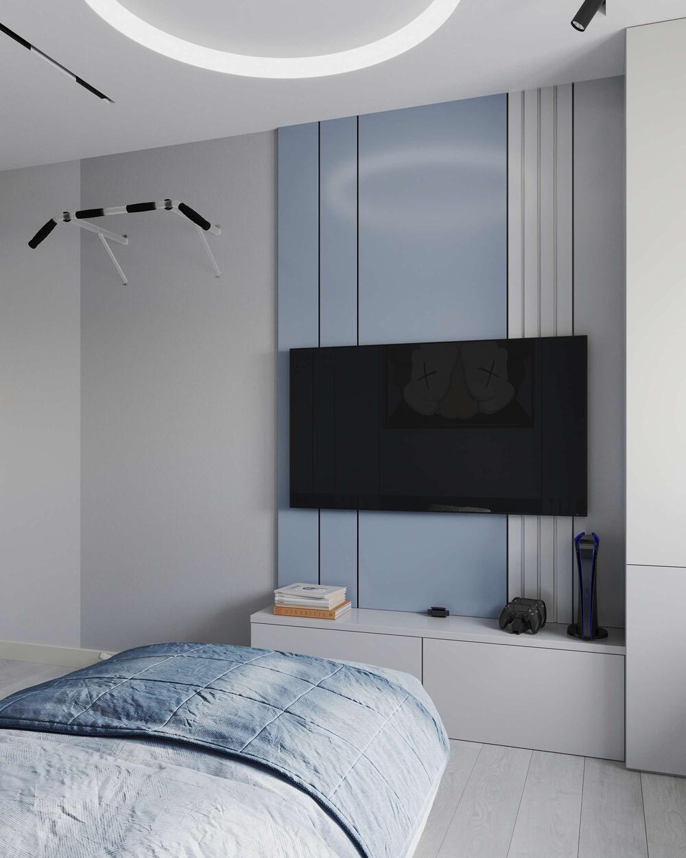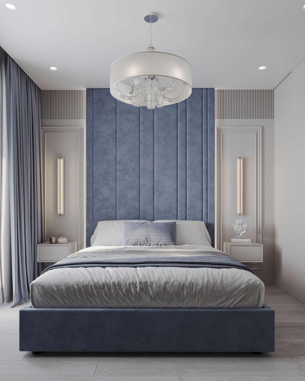 Основу палитры составляют спокойные серо-голубые оттенки с вкраплениями насыщенного синего — они создают сдержанную, но выразительную атмосферу. Центральное место занимает кровать с мягким бархатистым изголовьем и подсветкой в нижней части. За кроватью — декоративная стеновая панель с вертикальным ритмом и вставками под обивку.