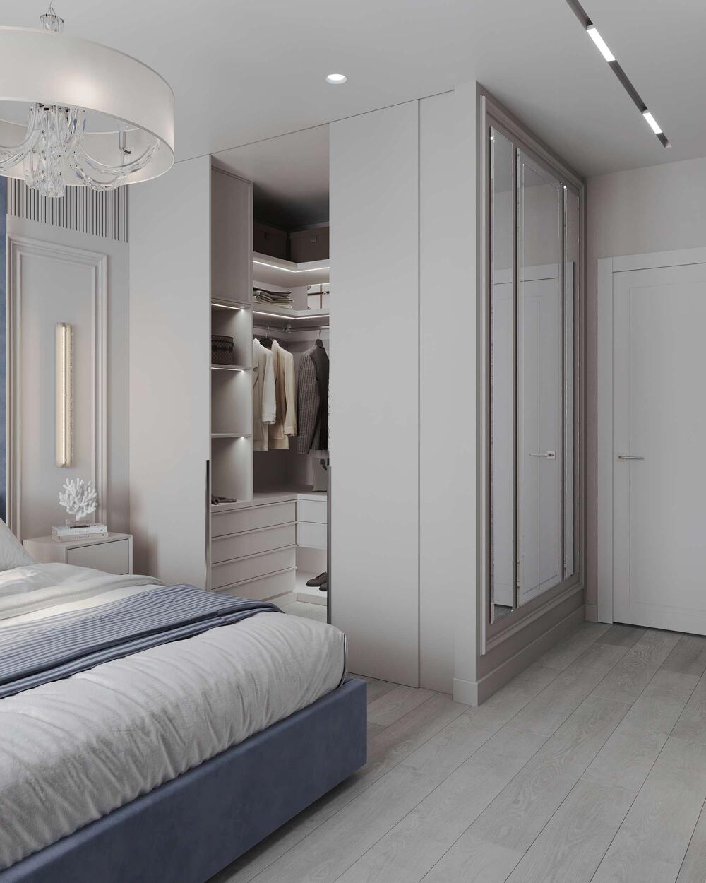 Гардеробная при спальне скрыта за дверьми и оформлена в светлой палитре с системой хранения в два уровня: с полками, ящиками и штангами под одежду.