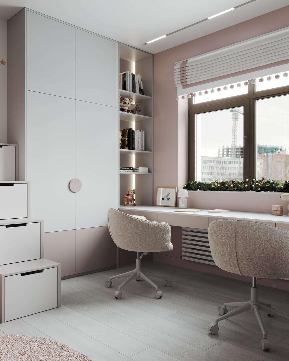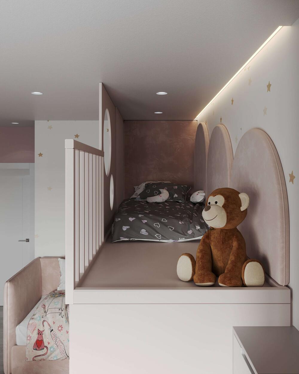 Комната для двух девочек стала настоящей сказочной зоной. Основу интерьера составляет нежная пудрово-розовая палитра, дополненная мягкими молочными и бежевыми оттенками. Центральный элемент — двухъярусная кровать-домик с оригинальным дизайном: снизу — два полноценных спальных места, сверху — игровая зона, оформленная с декоративными круглыми окнами и защитными рейками. Над каждой кроватью размещены авторские светильники в виде облаков с луной и каплями-светодиодами, что делает атмосферу сказочной даже вечером.