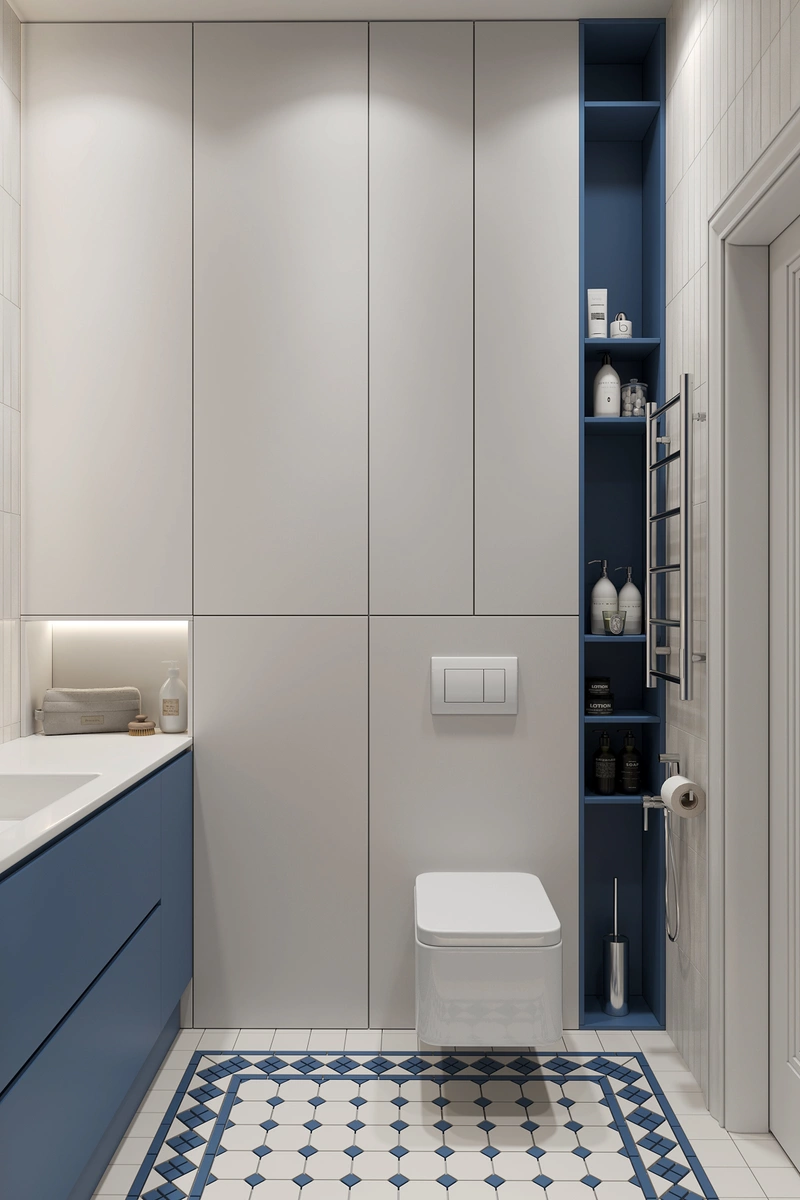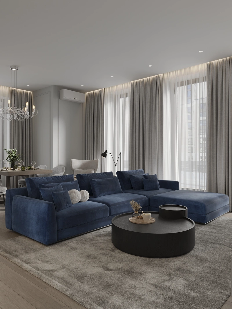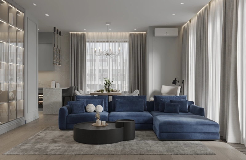 Базовые оттенки – белый, серый и голубой – создают ощущение лёгкости и простора, а насыщенные синие акценты добавляют глубины и динамики. Синий цвет встречается в обивке мебели, декоративных элементах и отделке стен, органично вписываясь в концепцию интерьера.