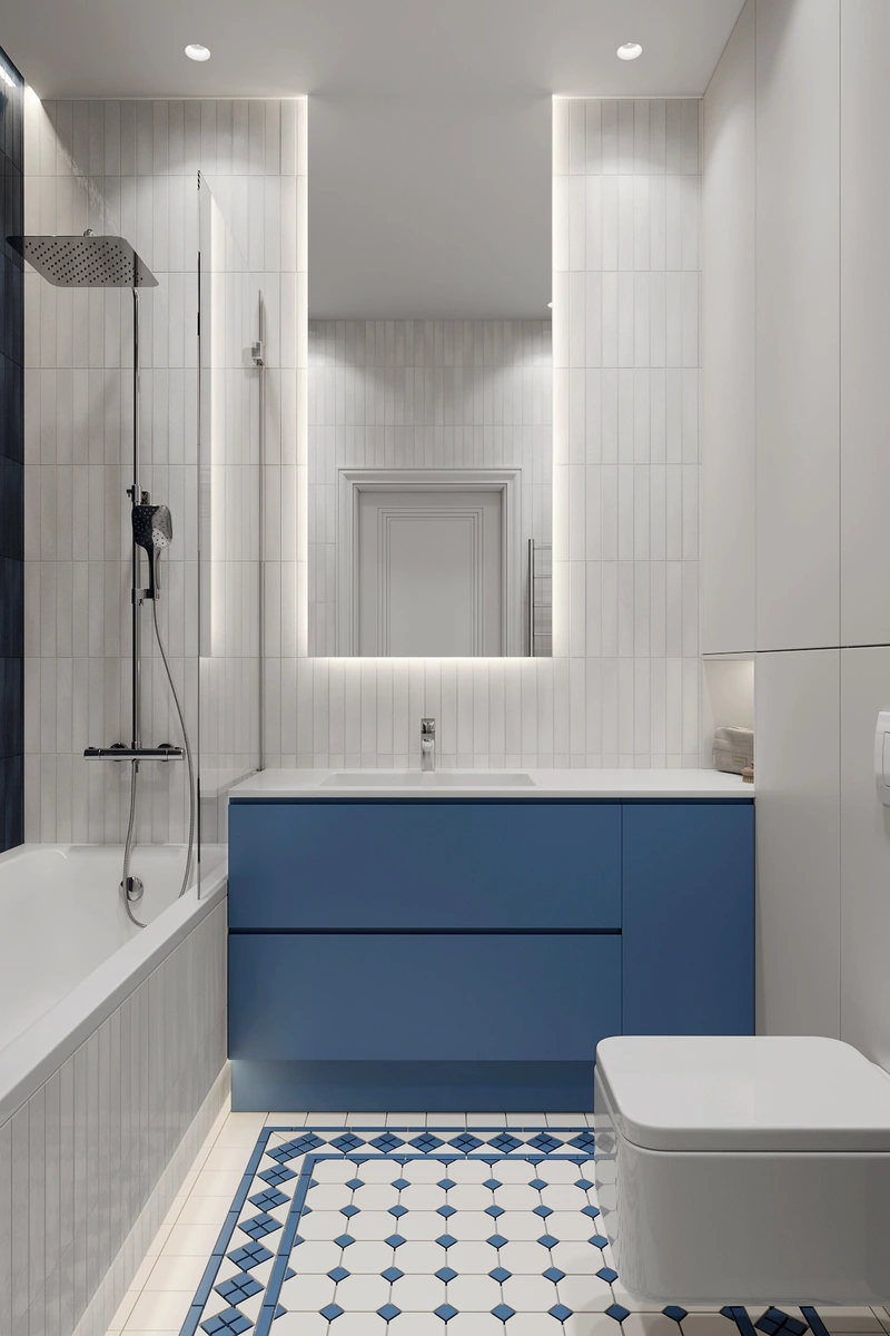 - Санузлы: Любимая плитка заказчика с мелким узором и чёрно-синими вставками, а также глубокий синий кафель с эффектом перелива в зоне ванной.