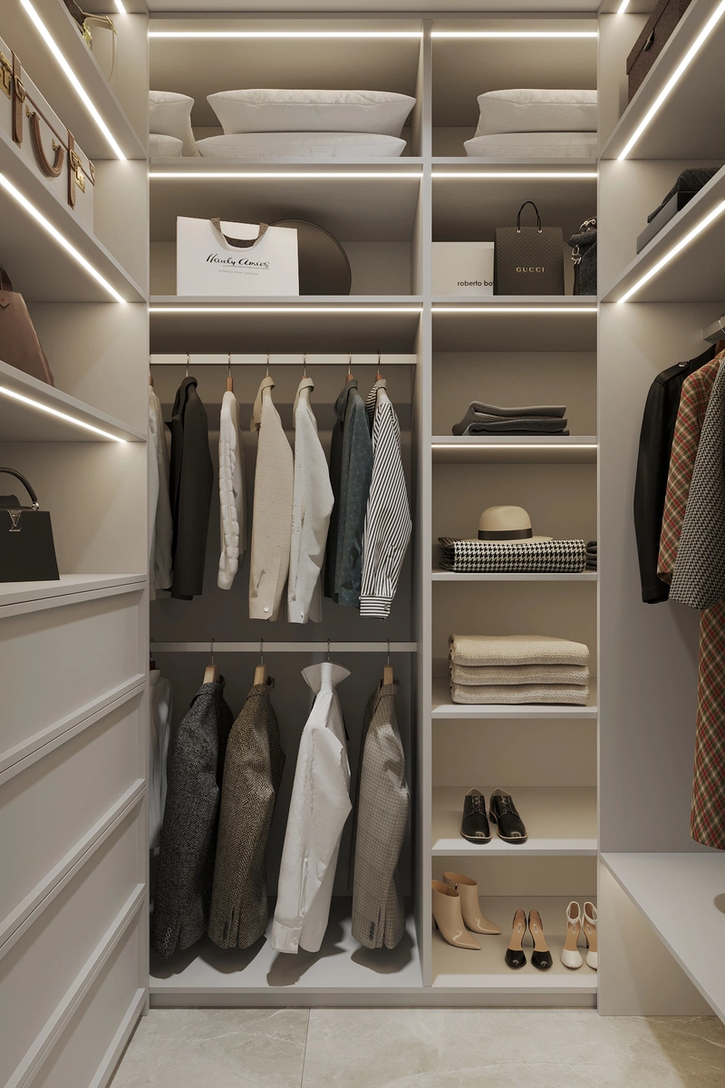 Система хранения включает секции для длинной и короткой одежды, полки для сложенных вещей, выдвижные ящики для аксессуаров и обувные полки. Подсветка встроена по периметру полок, что не только облегчает поиск вещей, но и придаёт интерьеру стильный, дорого выглядящий акцент.