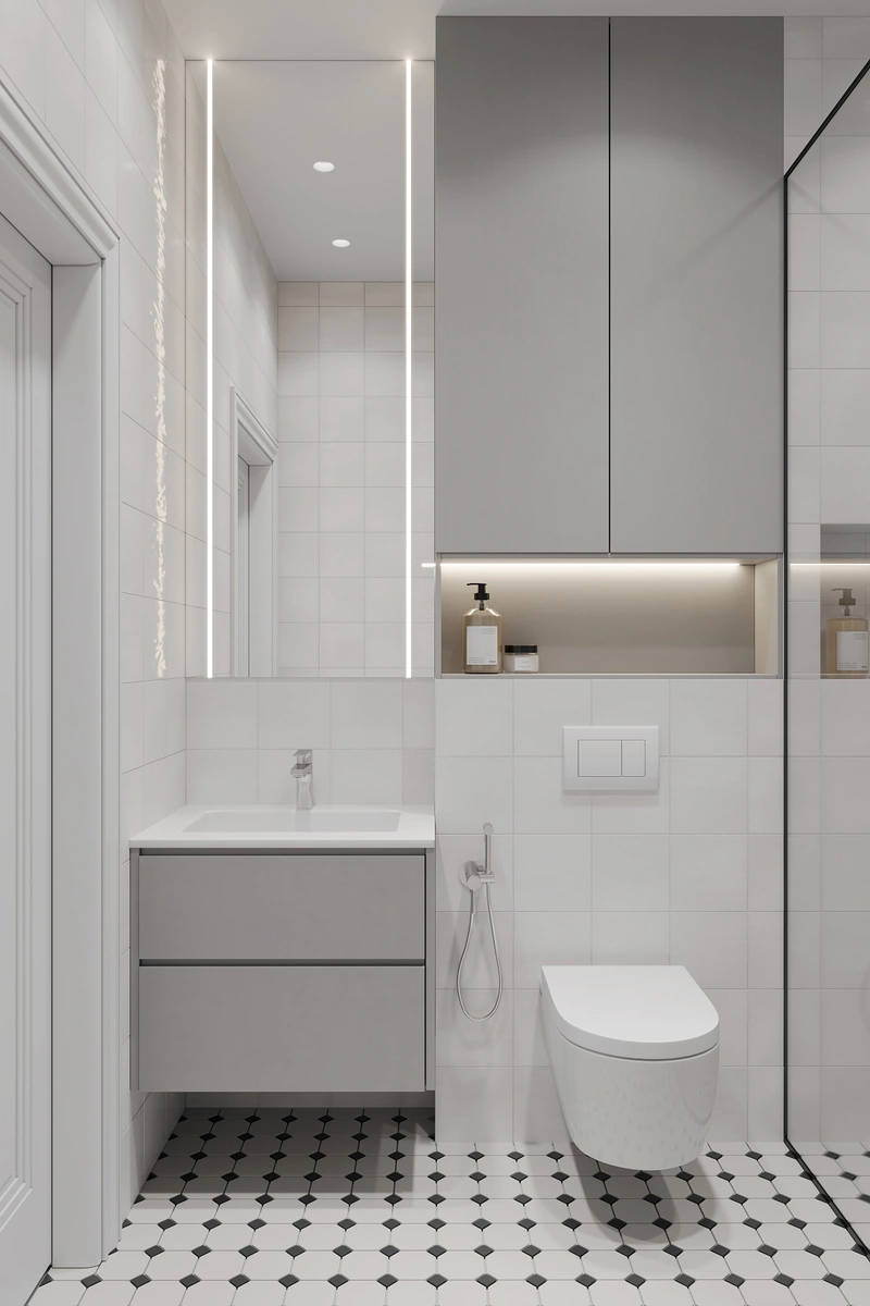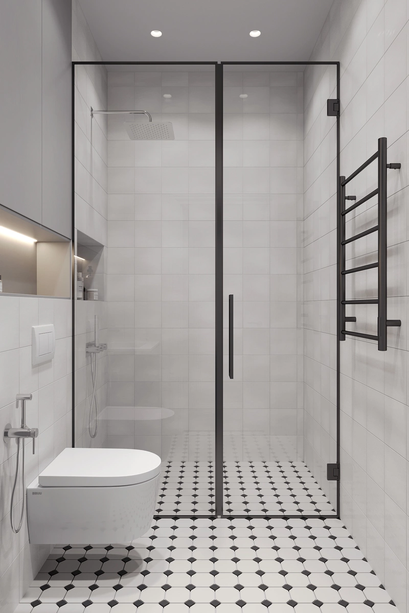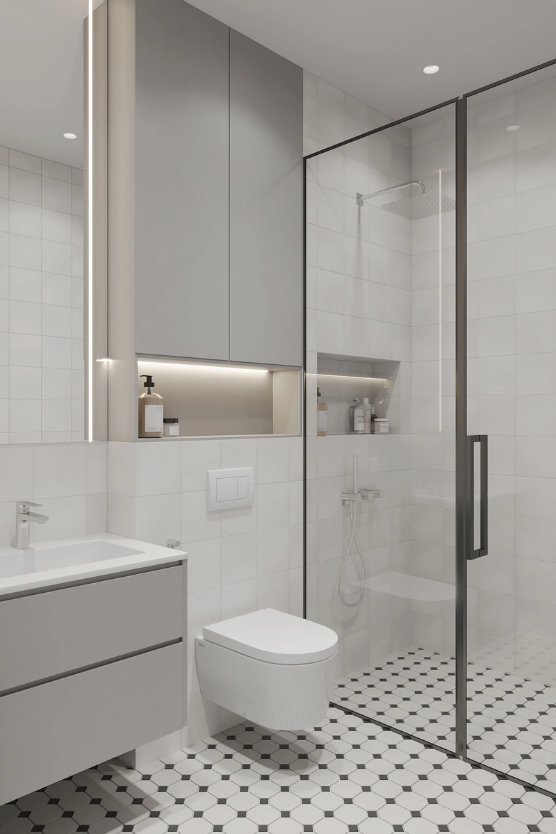 Душевая зона отделена стеклянной перегородкой с тонким чёрным профилем, что визуально облегчает пространство, сохраняя его открытым и воздушным. Встроенная ниша в душевой стене предназначена для хранения косметики и средств гигиены, обеспечивая удобство без лишних деталей.