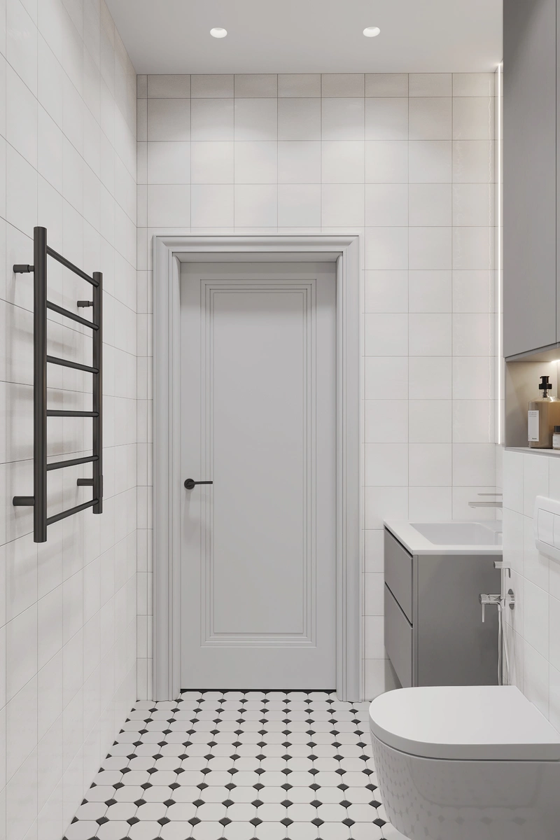 Подвесной унитаз с инсталляцией дополняет минималистичный облик санузла, а над ним расположены встроенные шкафы с гладкими серыми фасадами для хранения бытовых принадлежностей. Чёрный полотенцесушитель и смесители подчёркивают современный характер пространства и делают интерьер более выразительным.