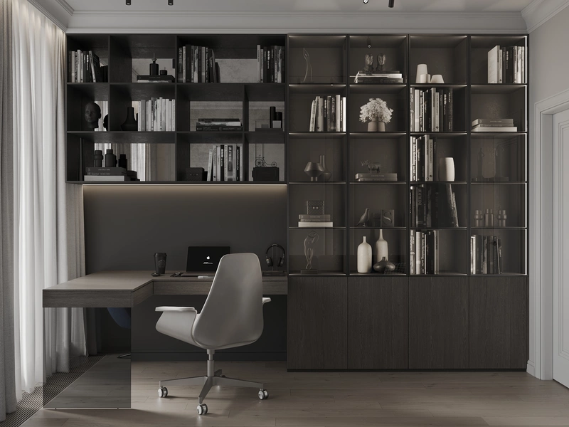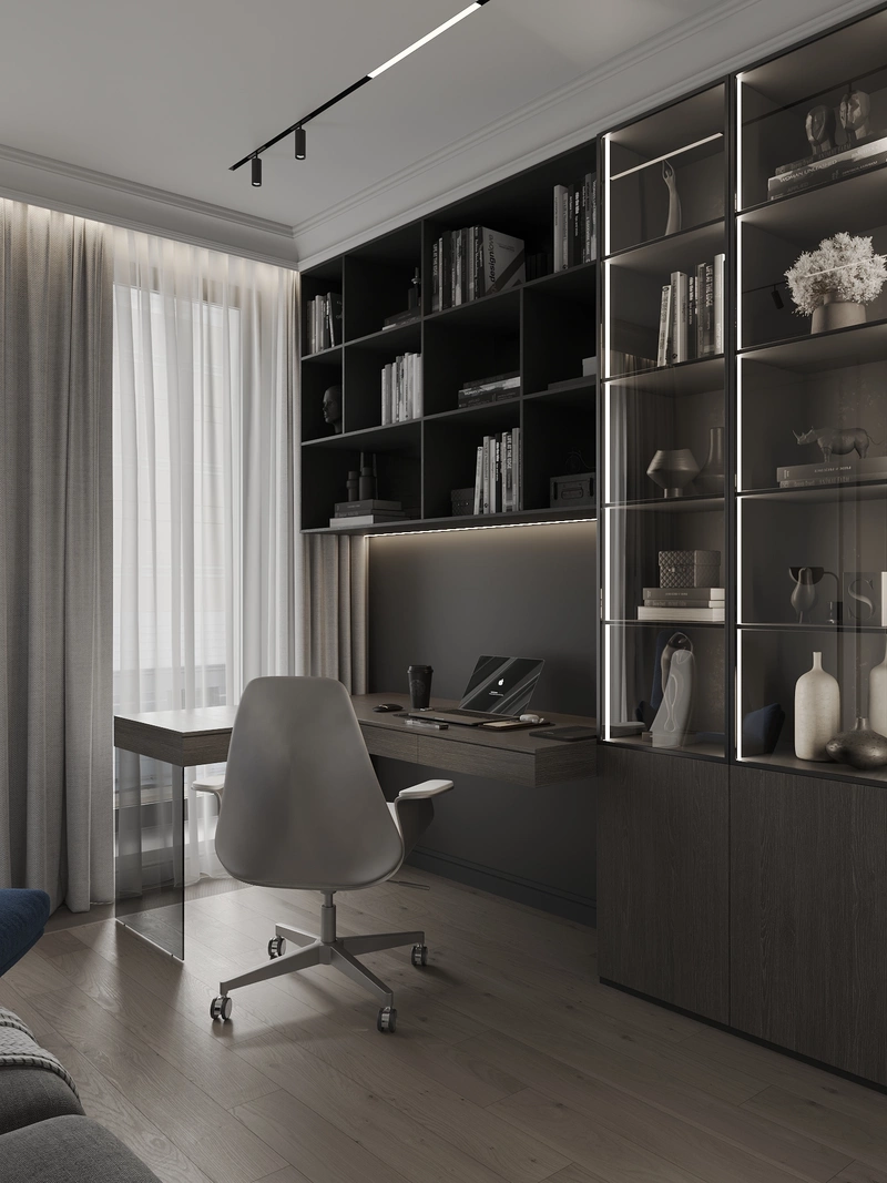 Во всю стену расположен вместительный книжный шкаф с открытыми и закрытыми секциями. Он создаёт эффект стильной домашней библиотеки. Встроенная подсветка подчёркивает архитектурную геометрию и придаёт интерьеру глубину.