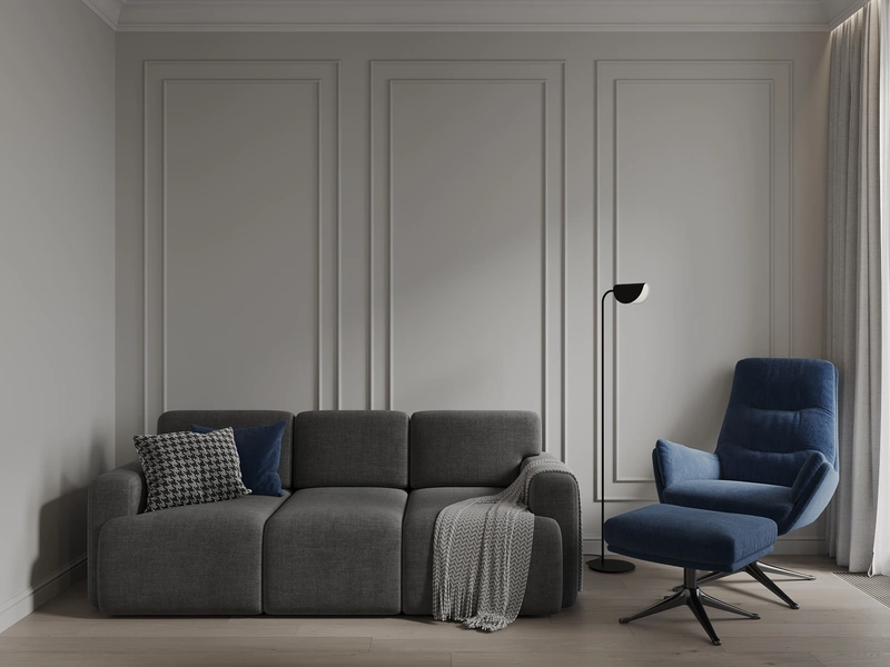 - Стены: Крашеные в светло-серый и серо-голубой оттенки, дополнены тонкими молдингами и 3D-панелями из полиуретана для создания глубины и выразительности.