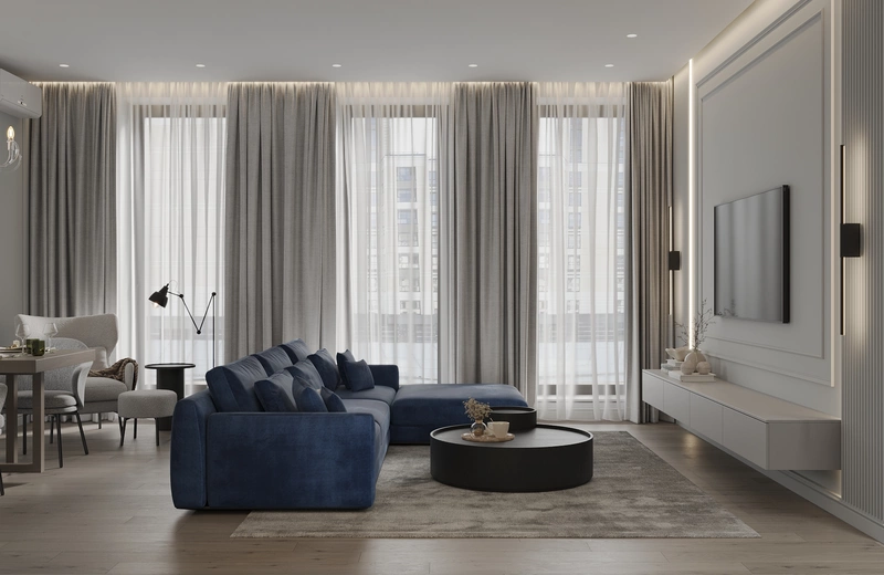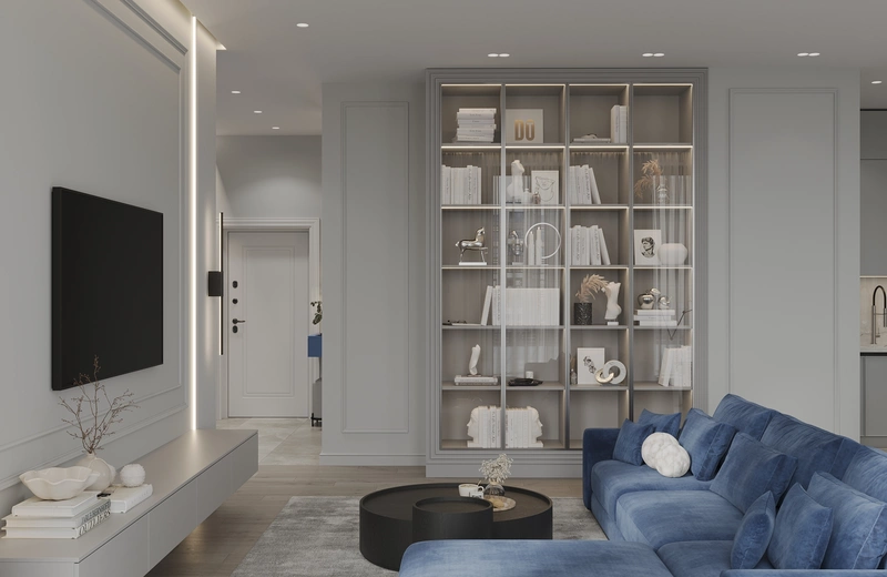 Центральное место занимает глубокий синий диван, который становится выразительным акцентом на фоне светло-серых стен. Пространство дополнено мягкими серыми креслами с округлыми спинками. Зона ТВ оформлена декоративными молдингами и встроенной подсветкой. Освещение продумано таким образом, чтобы создать несколько сценариев: точечные светильники на потолке дают общий рассеянный свет, а бра по бокам телевизора создают мягкое дополнительное освещение.