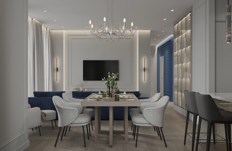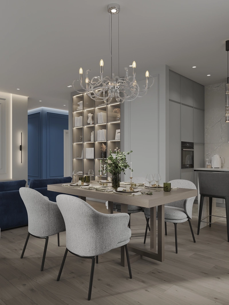 Обеденная группа расположена рядом с диванной зоной и включает в себя массивный деревянный стол в припылённом серо-коричневом оттенке и удобные мягкие стулья. Хрустальная люстра над столом придаёт интерьеру классический шарм. Особенностью гостиной стало перетекающее пространство с прихожей и кухней. Благодаря отсутствию дверей и узких проёмов видна яркая синяя стена в коридоре, которая служит выразительным цветовым акцентом. Этот эффект дополнительно усилен встроенной подсветкой.