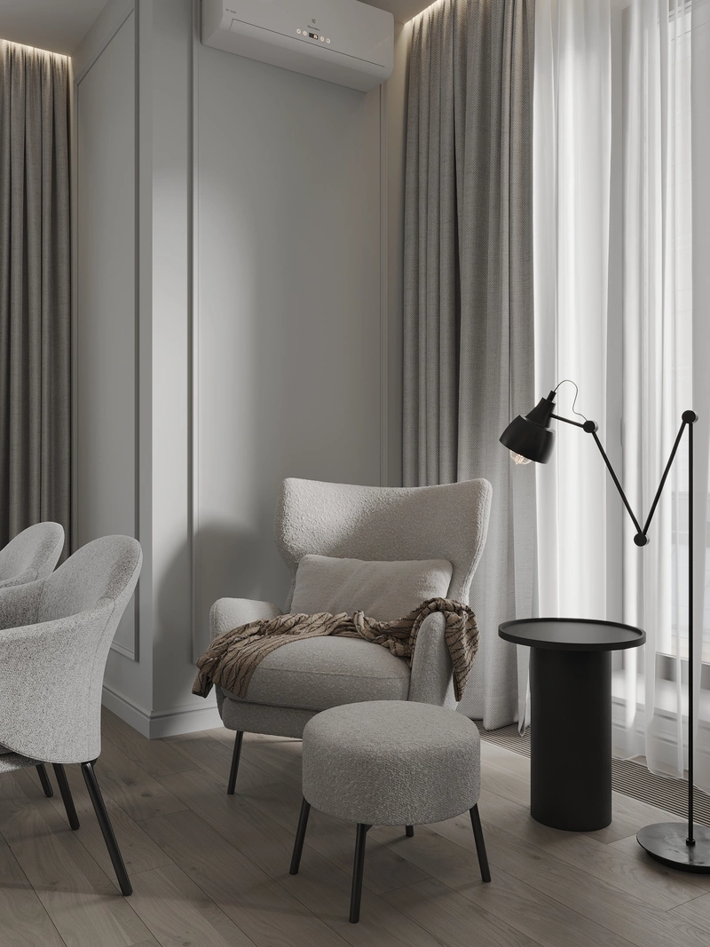 Дополнительно в кабинете предусмотрена зона отдыха – мягкое кресло с пуфом и напольный торшер создают идеальное место для чтения и расслабления. Пол выполнен из светлой инженерной доски, что делает помещение визуально лёгким и гармонирующим с общей концепцией квартиры.