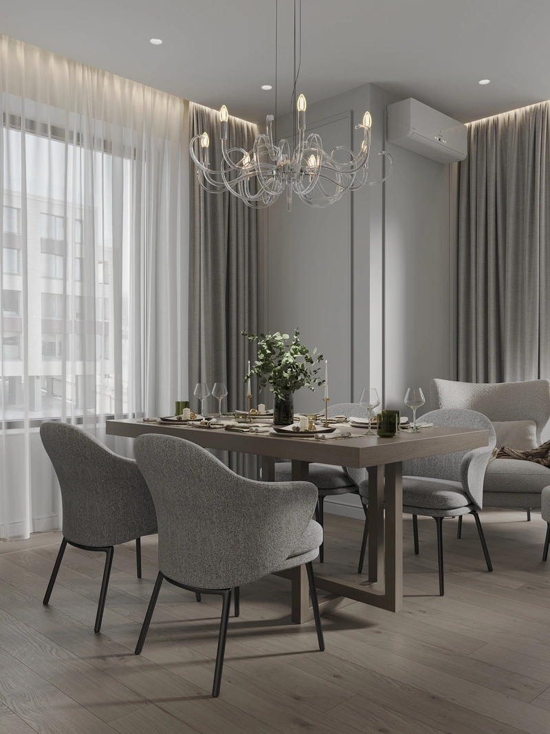 - Мебель: Лаконичные встроенные шкафы с матовыми серыми фасадами, деревянный стол с приглушённым серо-коричневым оттенком.