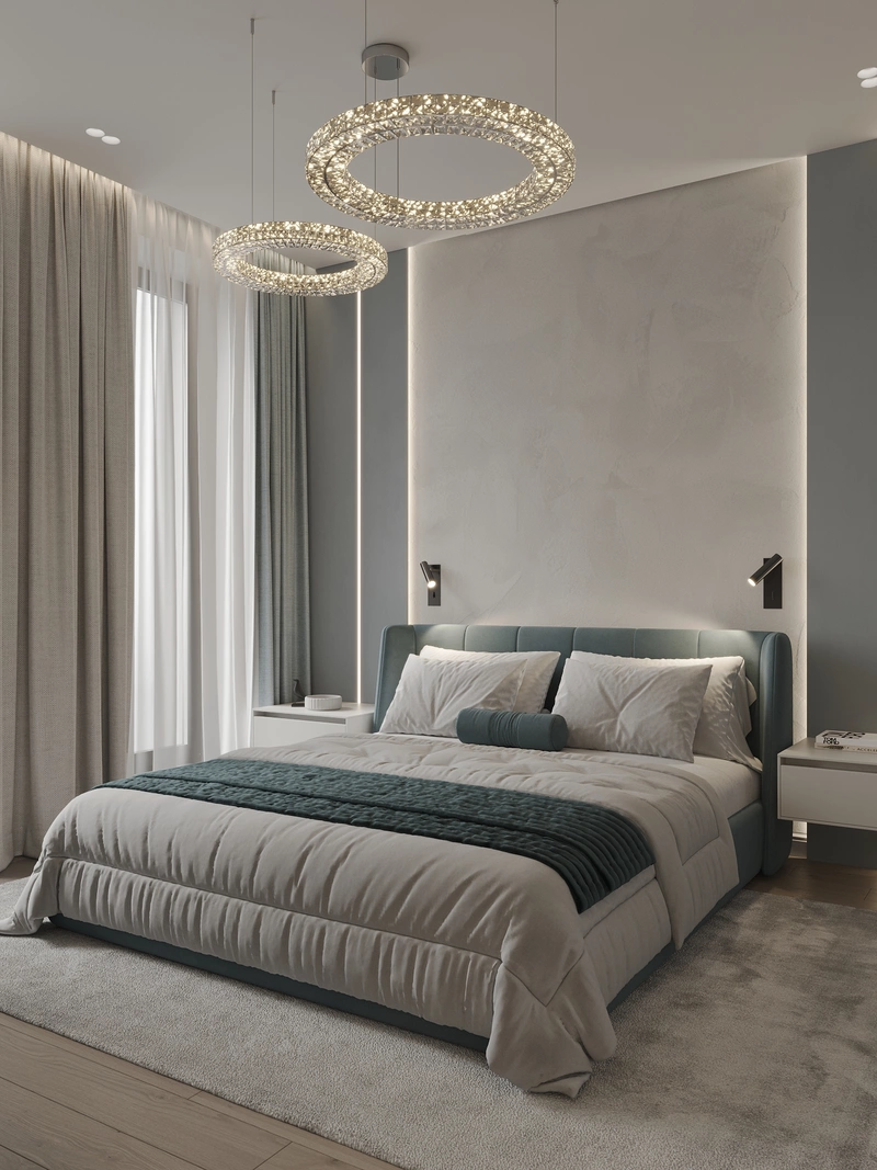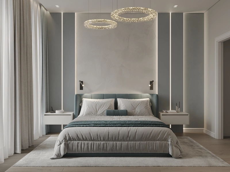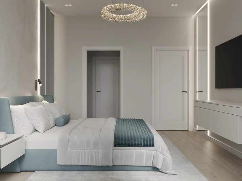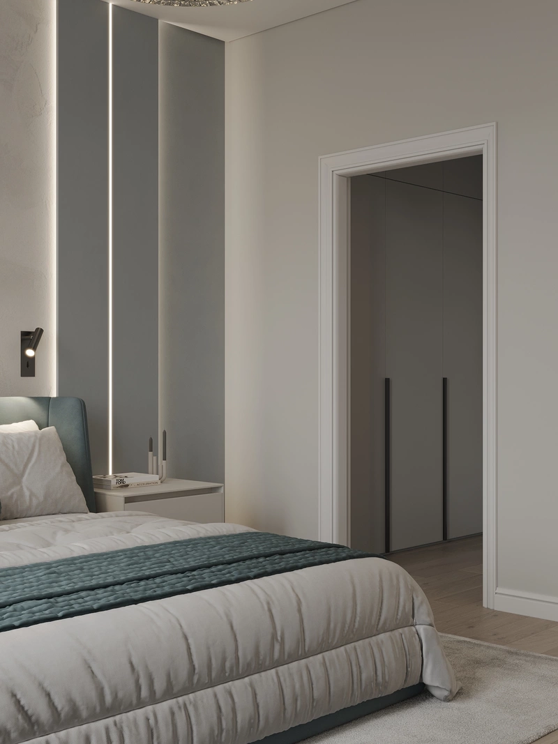 Спальня оформлена в светлой, спокойной палитре с акцентами насыщенного синего. Центральное место занимает кровать с мягким текстильным изголовьем в глубоком сине-зелёном оттенке. Для создания визуального равновесия кровать смещена асимметрично, а симметрия восстановлена декоративными фальш-стенами с вертикальной подсветкой.