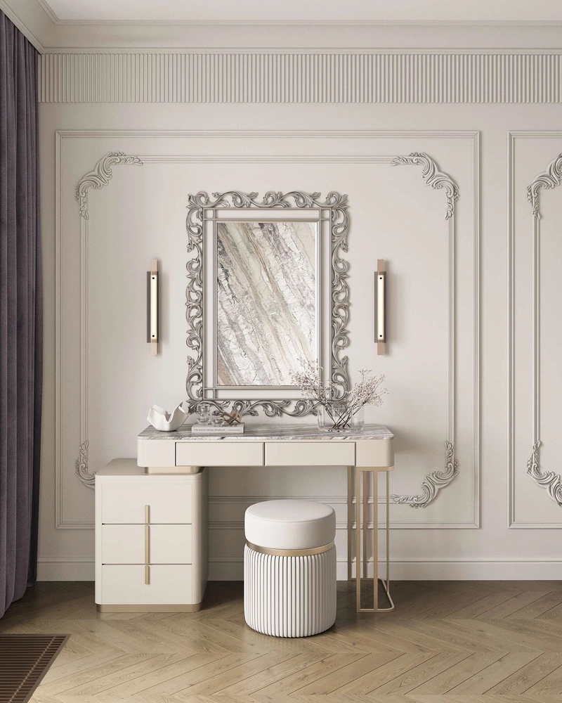 - Консоль с мраморной столешницей подчеркивает премиальность пространства.
