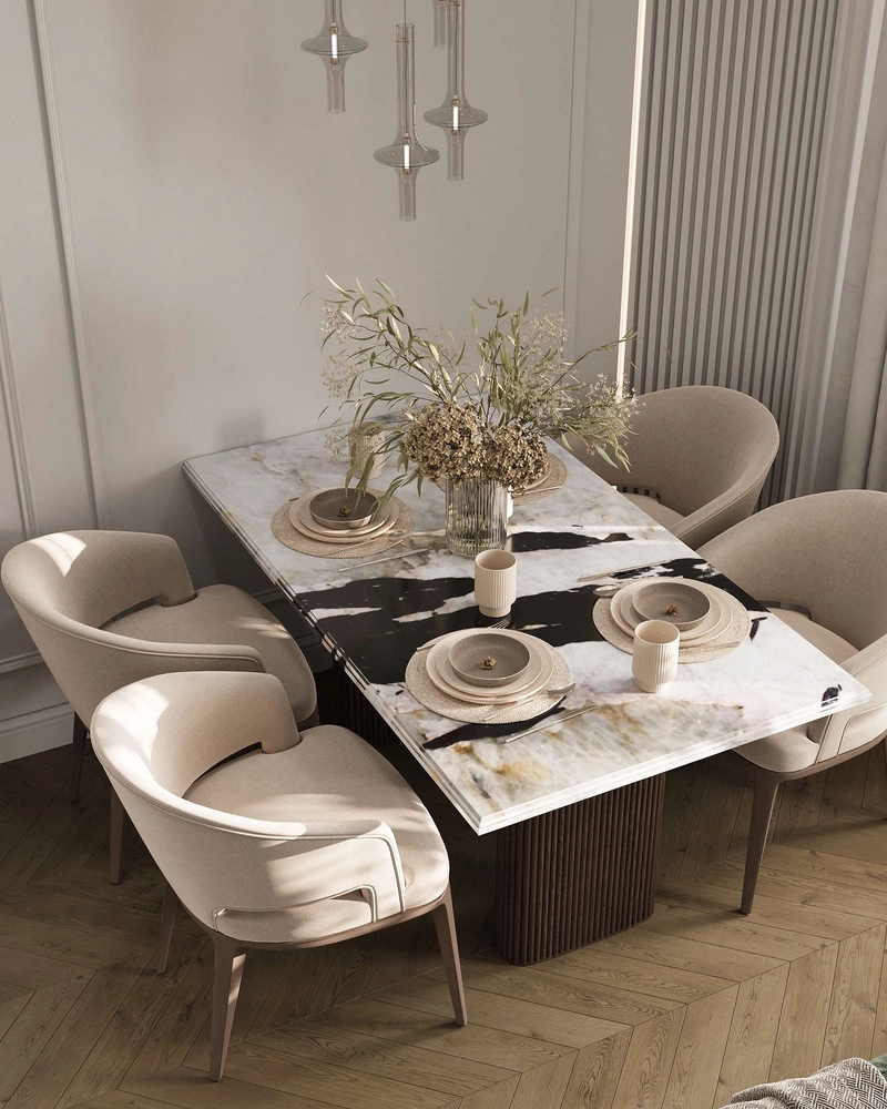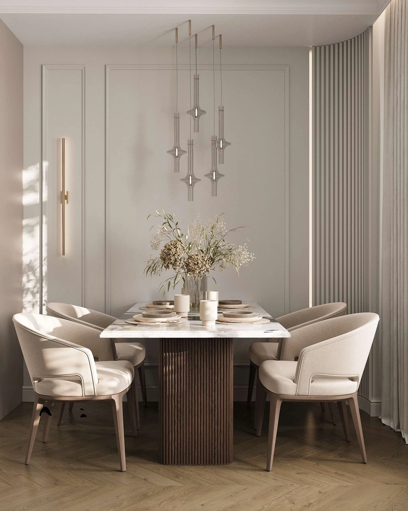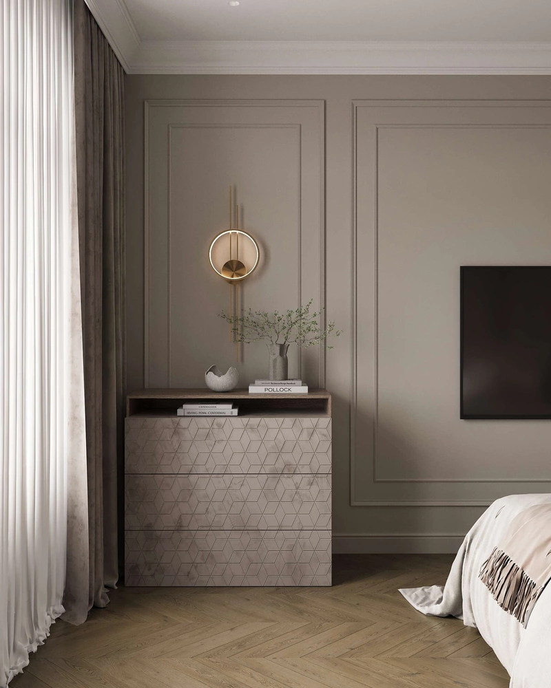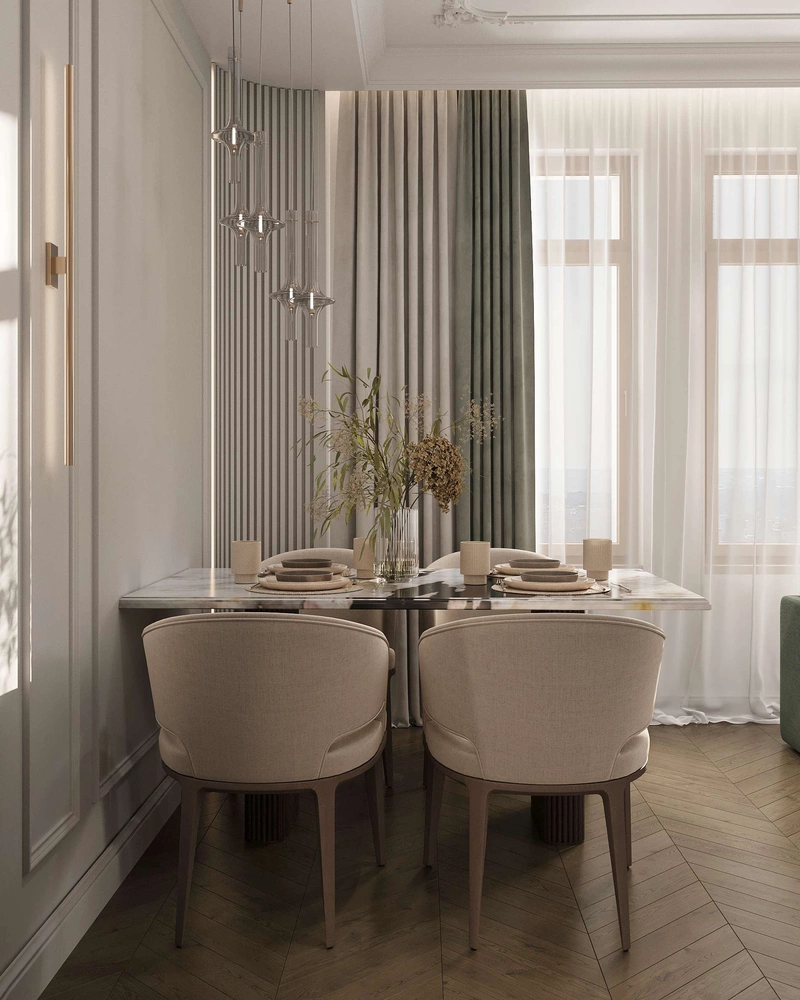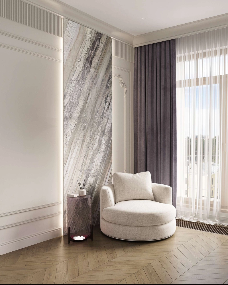 Интерьер квартиры выполнен в стиле современной неоклассики, где благородные материалы, изысканные текстуры и продуманное освещение создают атмосферу элегантности и уюта.