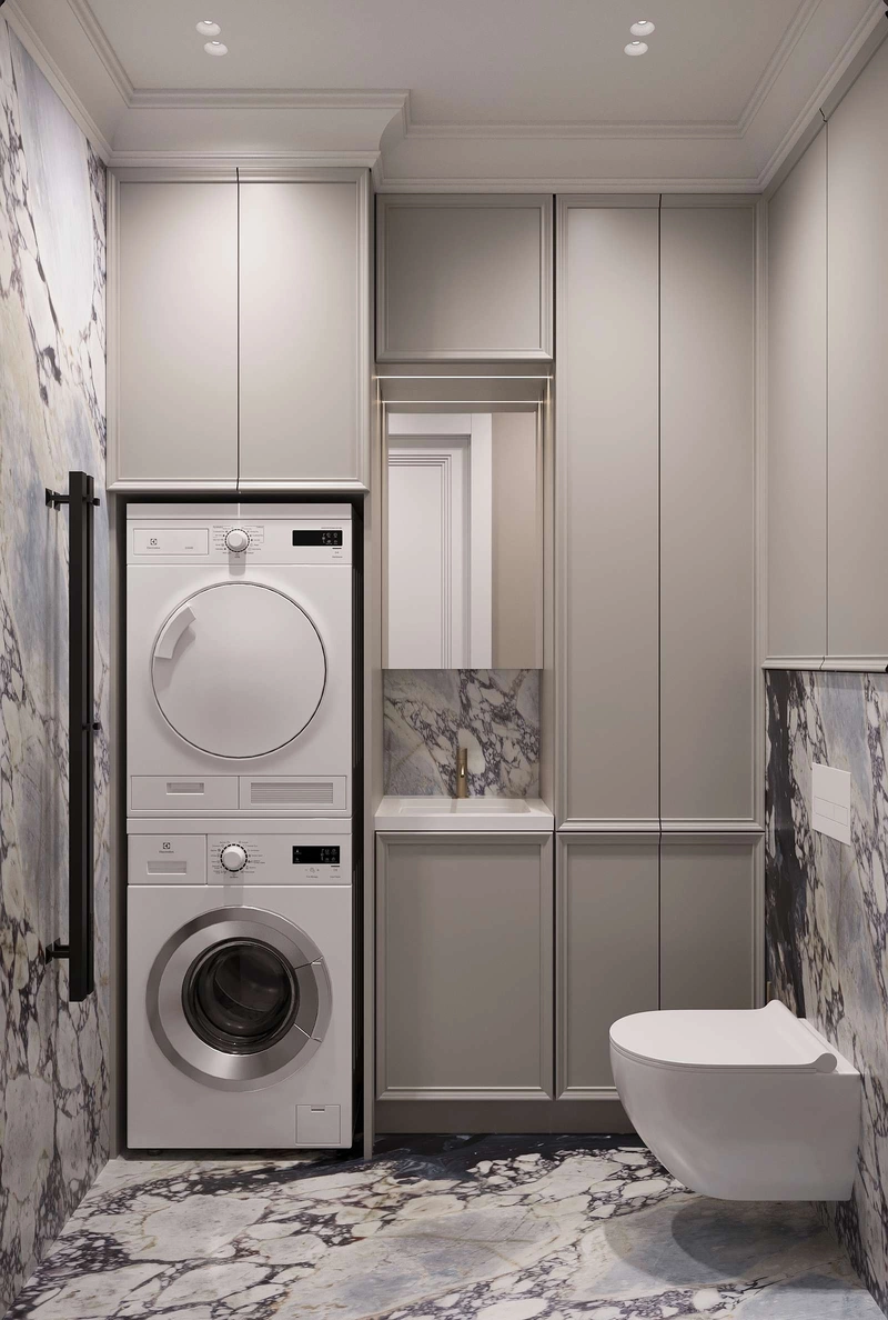 - Разместили унитаз, колонну со стиральной и сушильной машинами, удобную систему хранения.