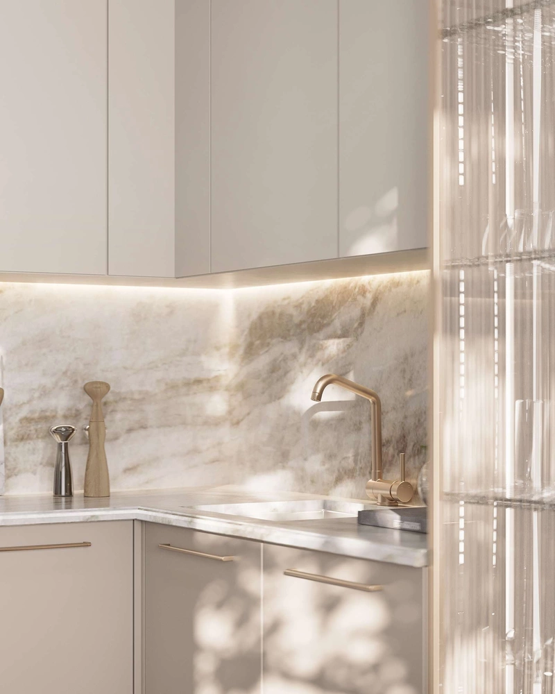 Кухня выполнена в Г-образной планировке, что позволило рационально использовать каждый метр. Верхние шкафы доходят до потолка, обеспечивая максимум места для хранения. Фартук и столешница стали главным акцентом зоны – они выполнены из натурального кварца с медово-горчичными прожилками, который тщательно подбирался вместе с заказчиками. Освещение на кухне многослойное. Встроенная подсветка рабочей зоны делает процесс готовки комфортным, а декоративные светильники добавляют глубины интерьеру.