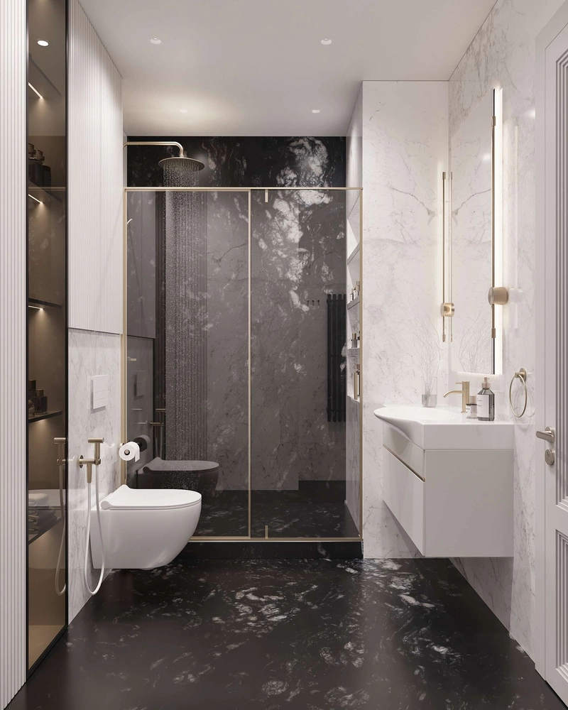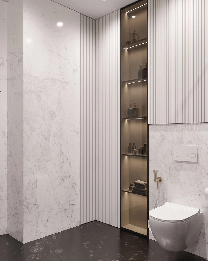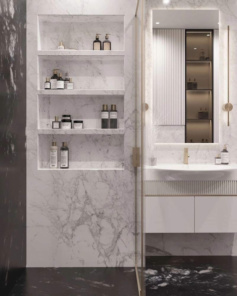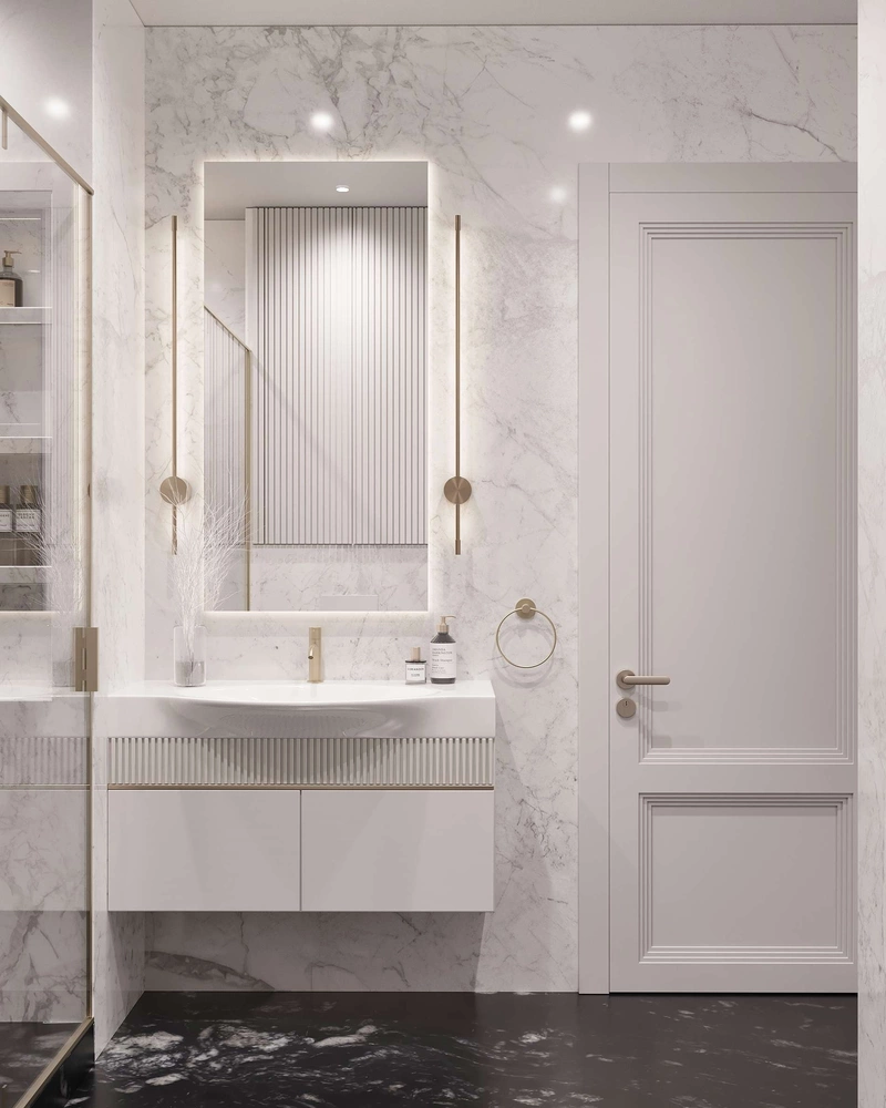 - Натуральный мрамор, гранит и кварц – ключевые акценты в санузлах и зоне ТВ.