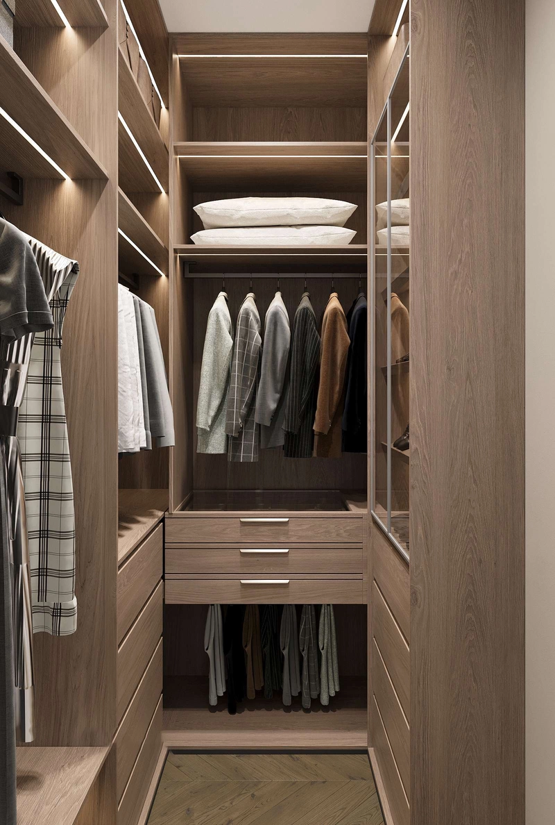 - Закрытые секции для хранения сезонных вещей и стеклянные витрины для аксессуаров.