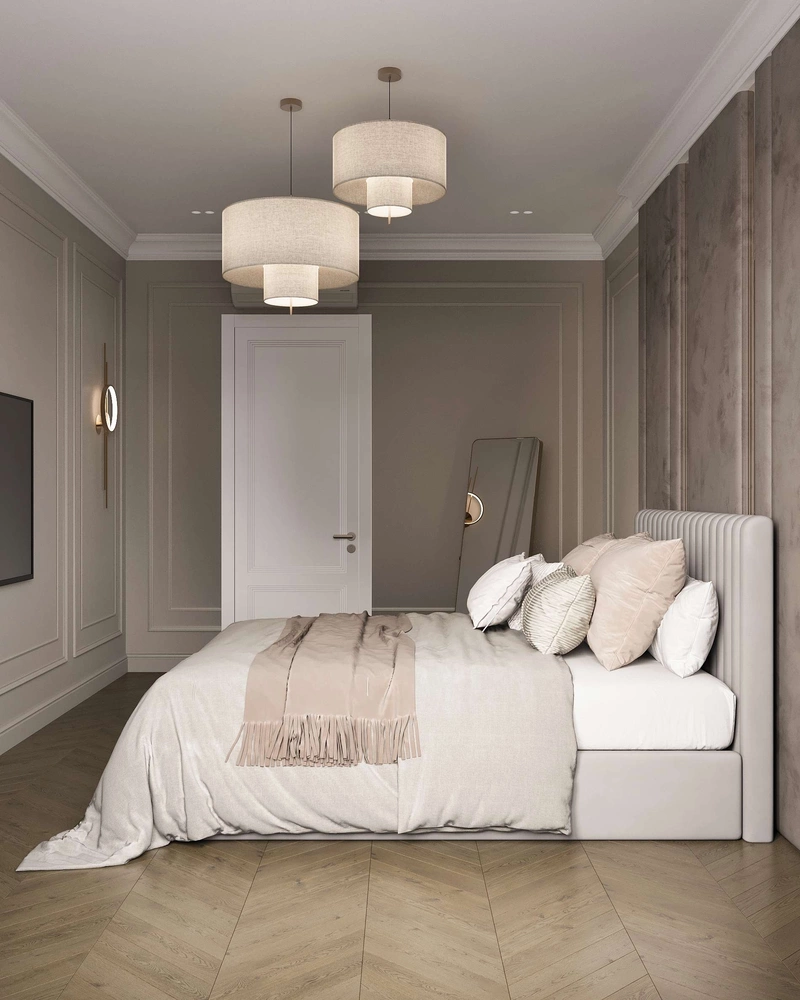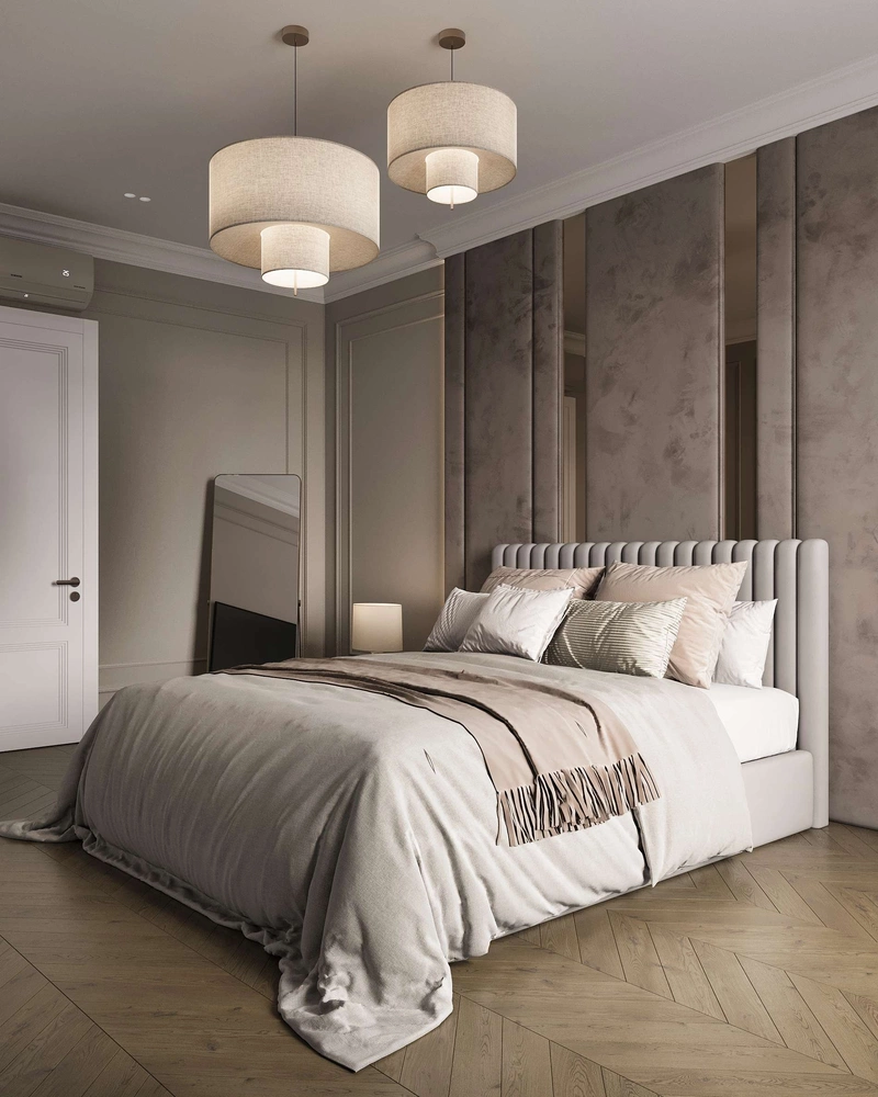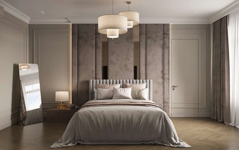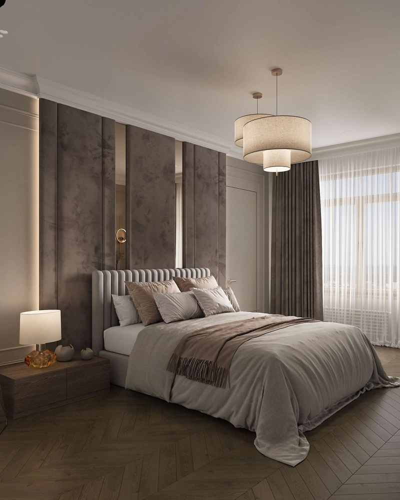 Это пространство, пропитано статусностью, глубиной и приватностью. В отличие от других зон квартиры, выдержанных в светлой гамме, здесь использованы насыщенные, обволакивающие темные оттенки, создающие атмосферу уединения и расслабления. Главный акцент спальни — мягкое панно за изголовьем кровати, выполненное из фактурных панелей с зеркальными вставками и встроенной скрытой подсветкой. Этот элемент не только добавляет глубины, но и визуально расширяет пространство.
