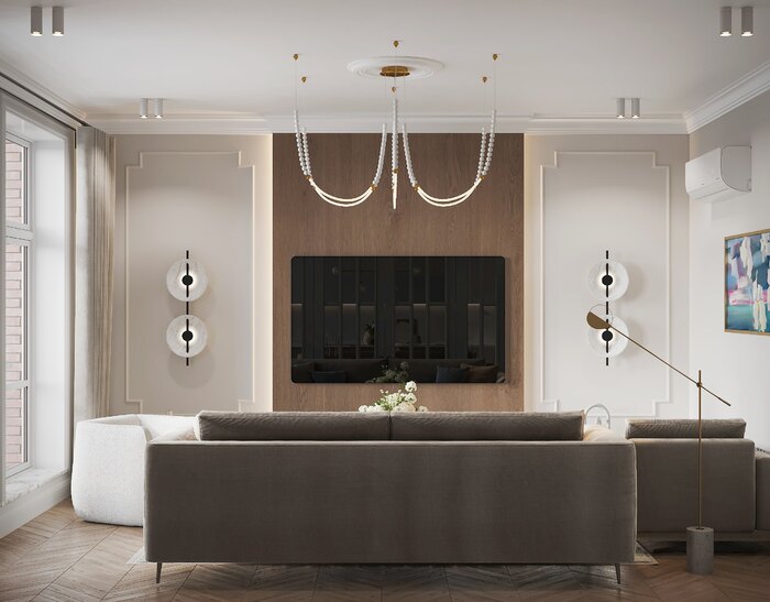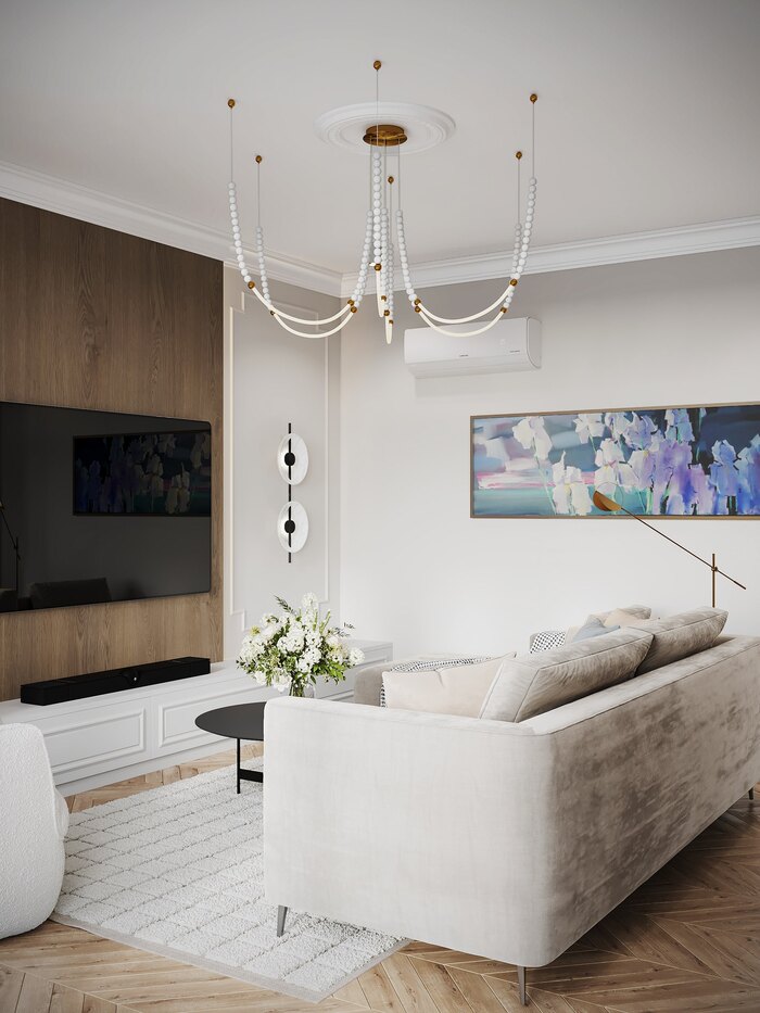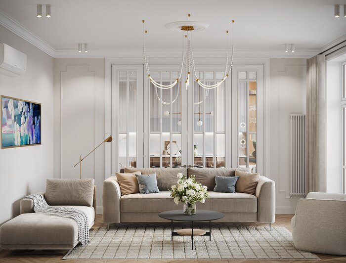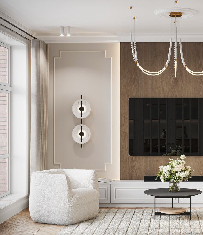 Интерьер выполнен в стиле лёгкой французской классики — с архитектурными деталями, лепниной, молдингами и симметричной композицией. При этом мебель и встроенные элементы имеют современное звучание: лаконичные формы, гладкие фасады, светильники в стиле минимализм. Этот микс делает интерьер уравновешенным и актуальным.