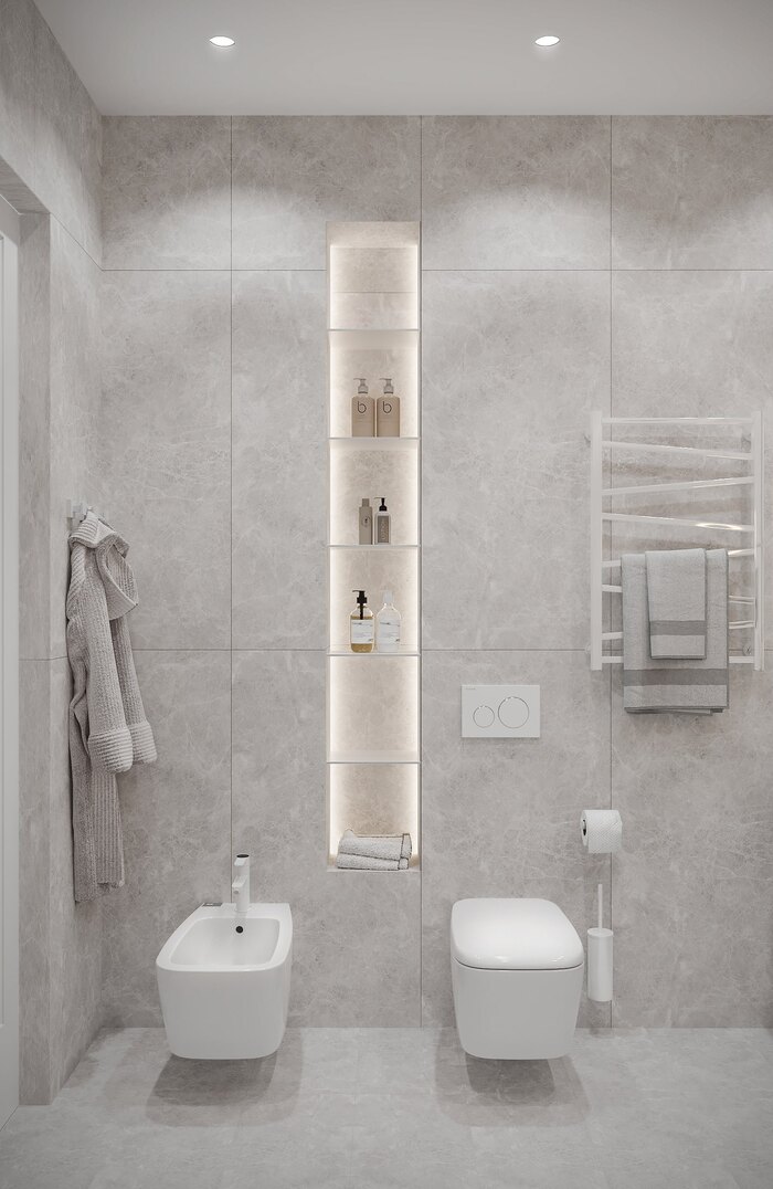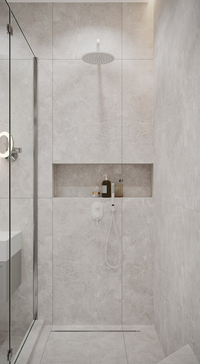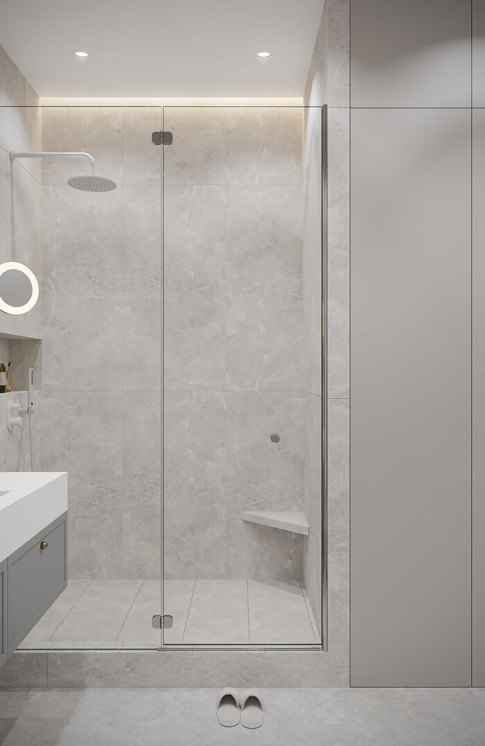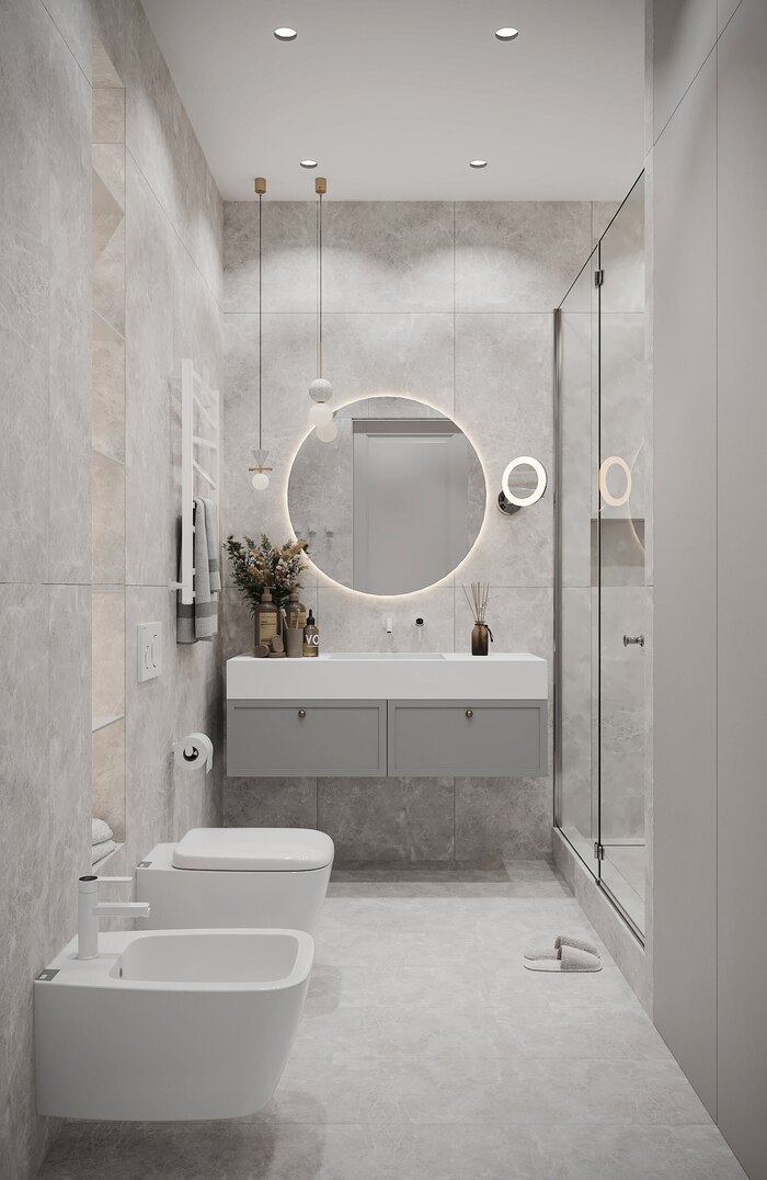 Душевая входит в состав мастер-блока и спланирована как отдельная ванная комната. Интерьер оформлен в светлой серой палитре с отделкой под мрамор. Пространство зонировано чётко и лаконично: по одной стороне — унитаз, биде и ниша с подсветкой для хранения, по другой — душевая с прозрачной перегородкой и встроенной скамьёй. Зона умывальника оформлена подвесной тумбой и круглым зеркалом с контурной подсветкой. В качестве дополнительного света — подвесные декоративные светильники. Все элементы встроены, линии чёткие и выверенные. Ванная получилась компактной, но визуально лёгкой и технологичной.