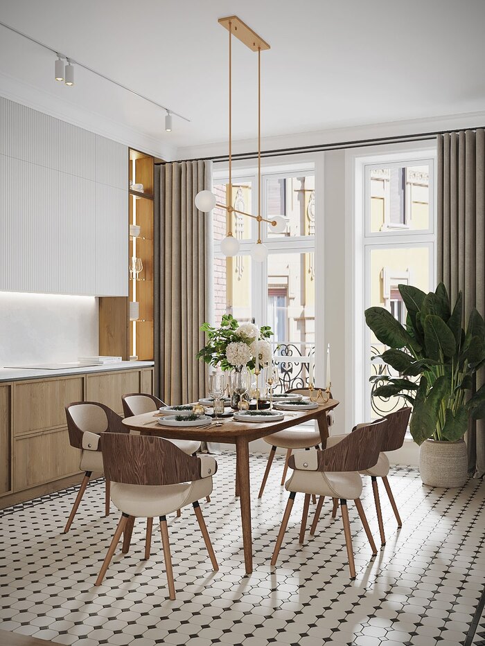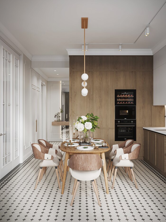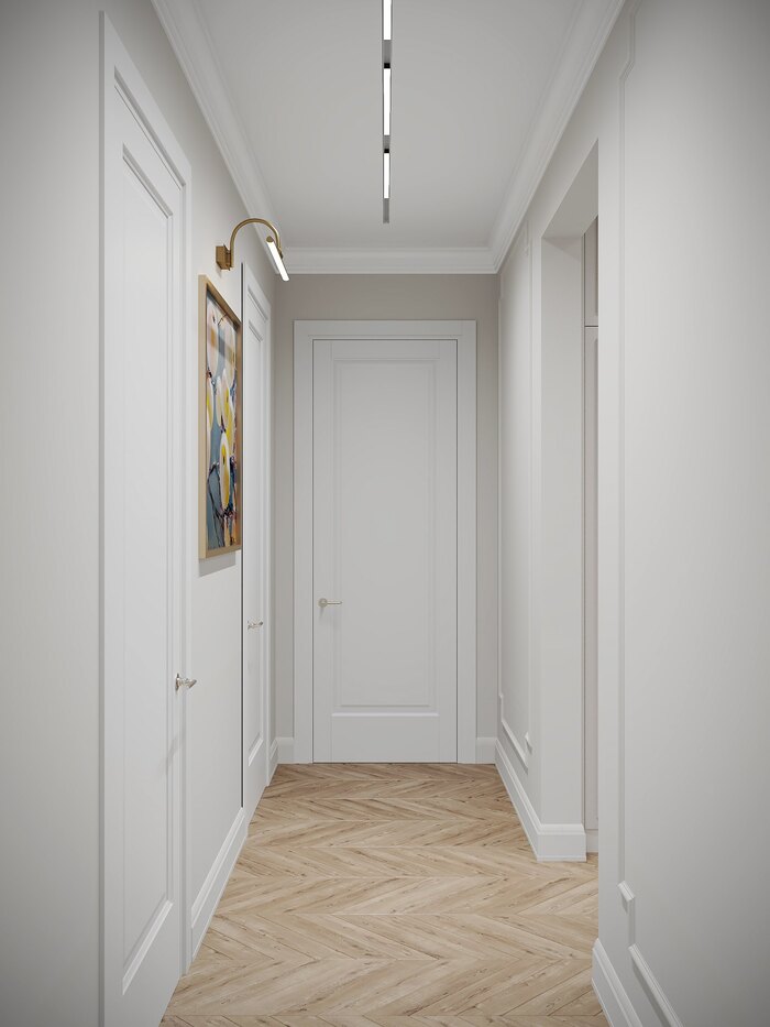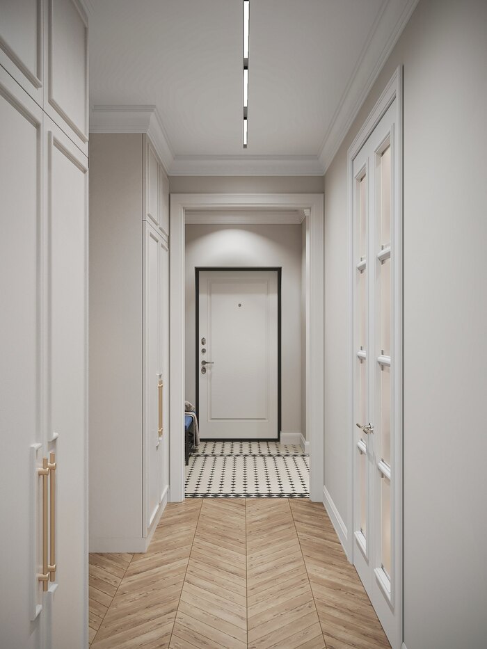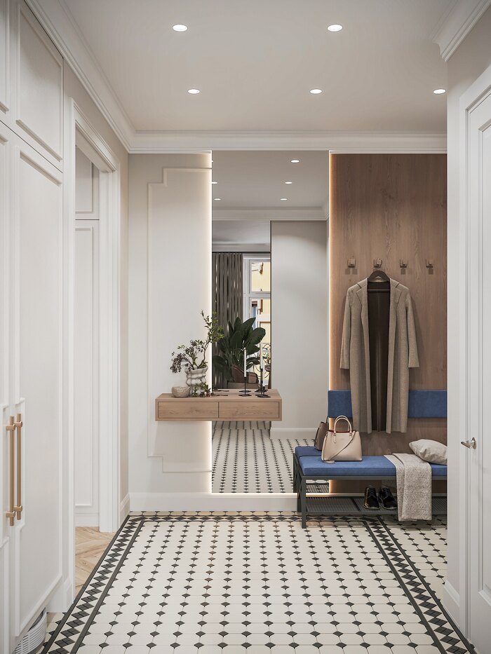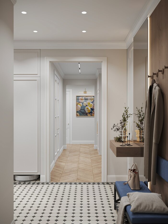 Плитка на полу с чётким геометричным узором переходит из прихожей в кухню, объединяя зоны визуально. Панно с молдингами и точечное освещение подчёркивают геометрию и придают пространству ритм. Прихожая получилась открытой, светлой и аккуратной — без визуального шума.