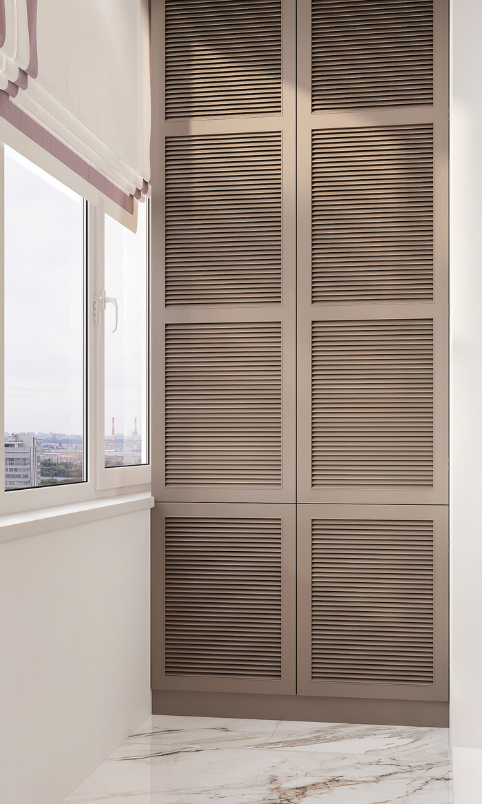 Балкон мы утеплили и превратили в полноценное рабочее место. Здесь разместили удобный стол у окна и розетки для техники, предусмотрели локальное освещение. За счёт этого появилось отдельное пространство для работы или учебы, не занимая площадь жилых комнат.