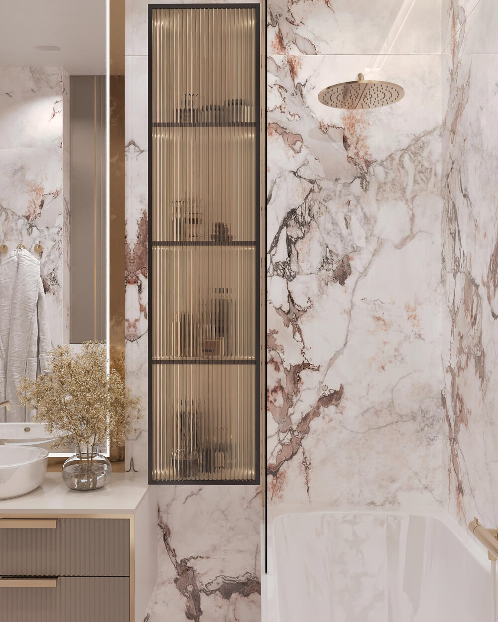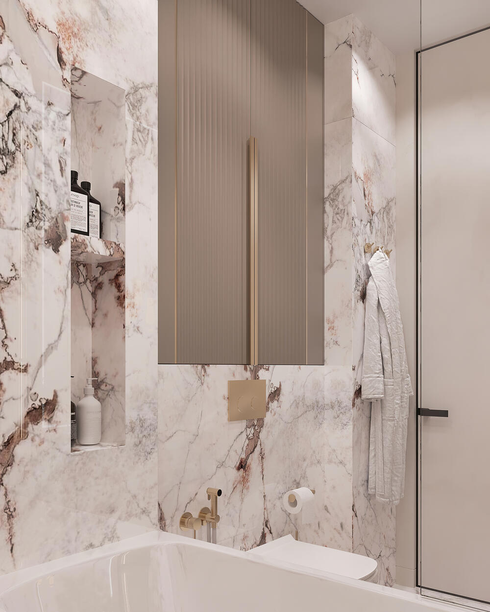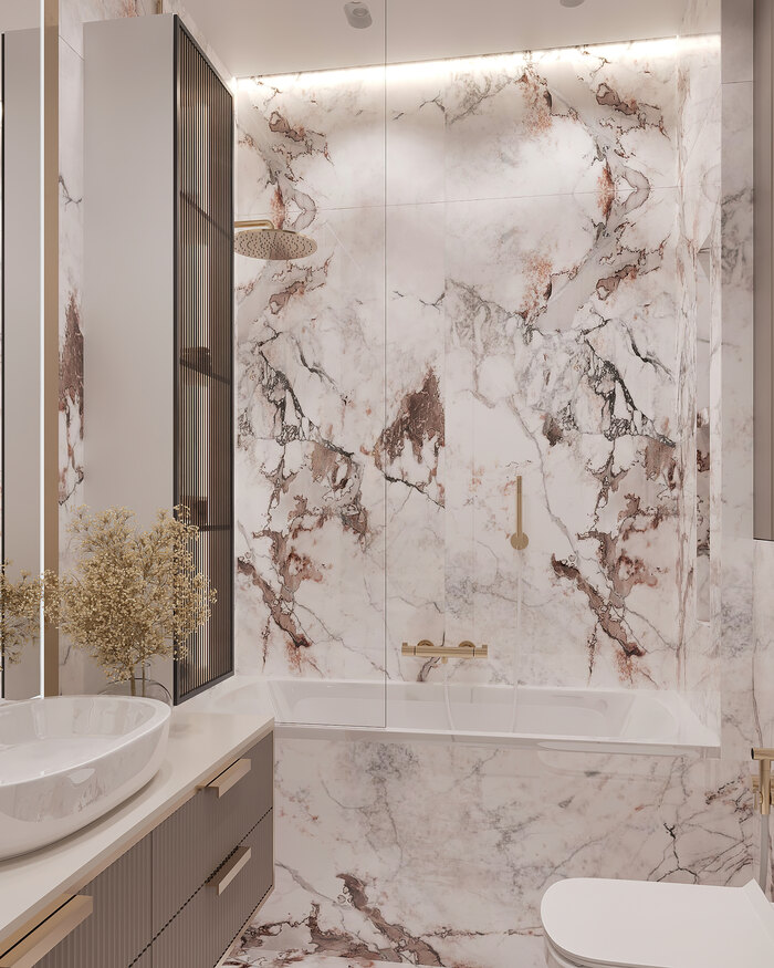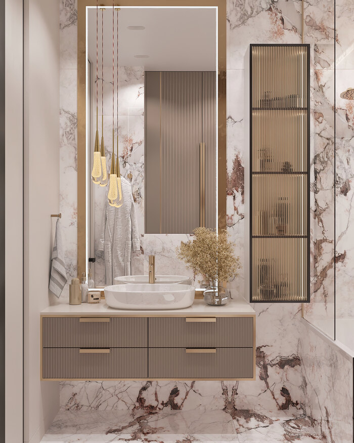 Камень (мрамор)— использован в отделке ванной и в акцентной панели за телевизором. Натуральная фактура добавляет интерьеру выразительности и статуса.Он устойчив к влаге и легко очищается — это практично для санузла и зон с высокой нагрузкой