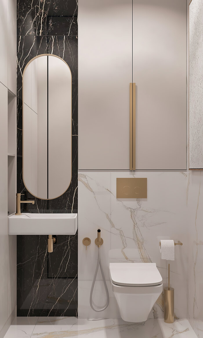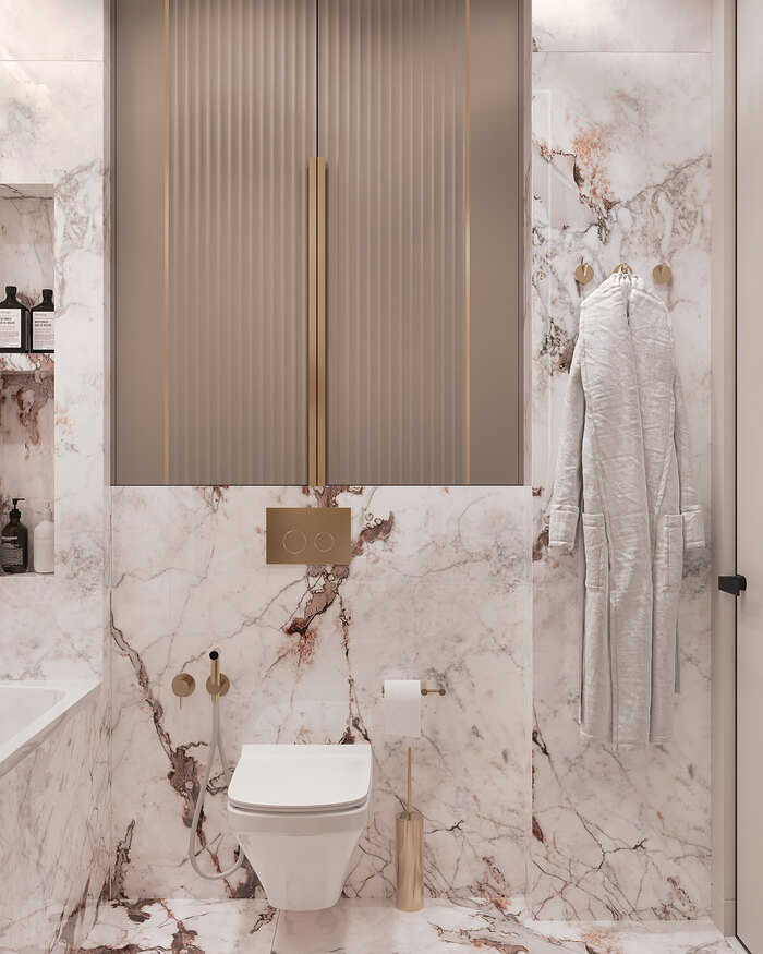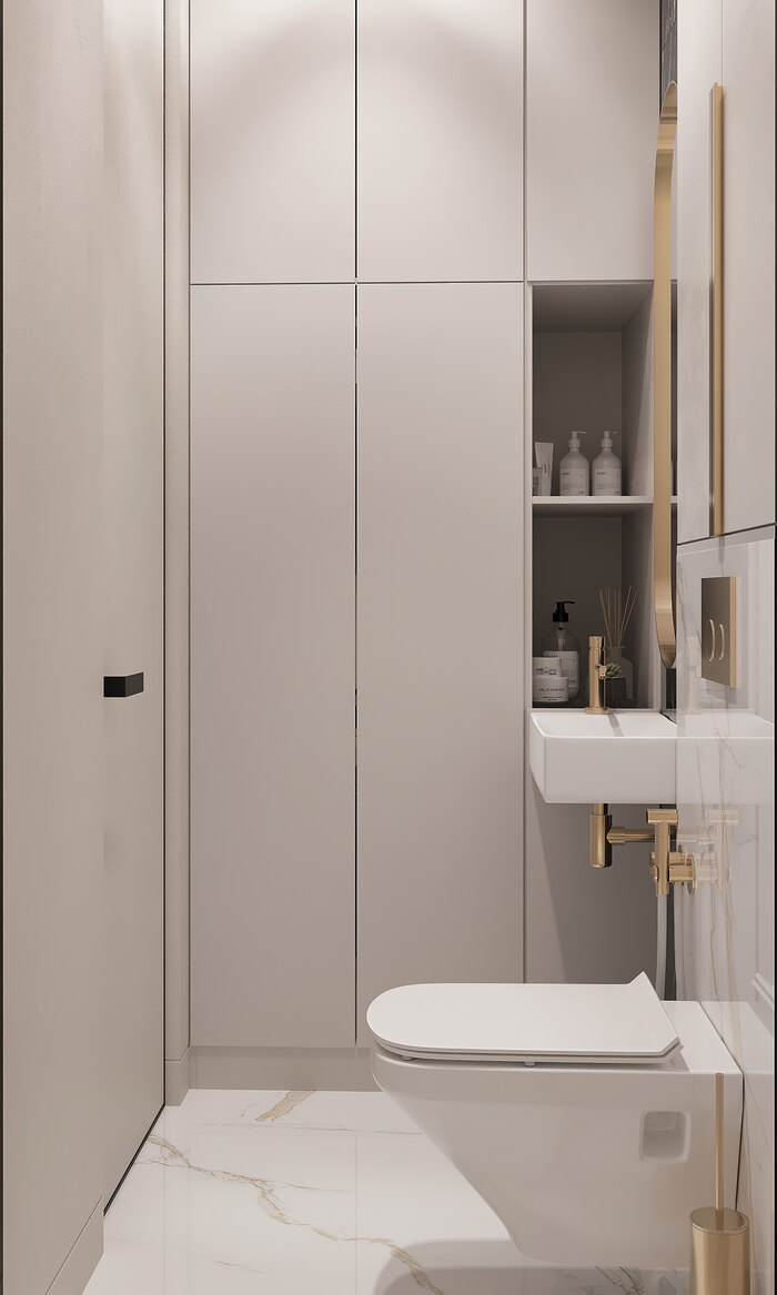 В ванной мы сделали акцент на удобство и рациональное использование пространства. Здесь разместились ванна, раковина с тумбой и встроенные шкафы для хранения. За счёт этого все бытовые мелочи скрыты, а интерьер остаётся аккуратным и чистым.