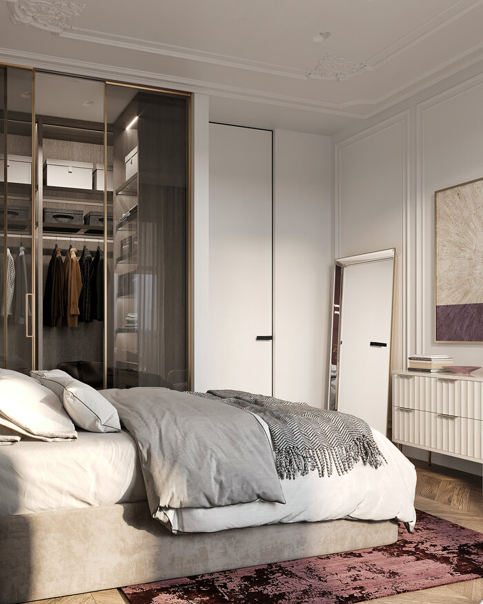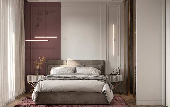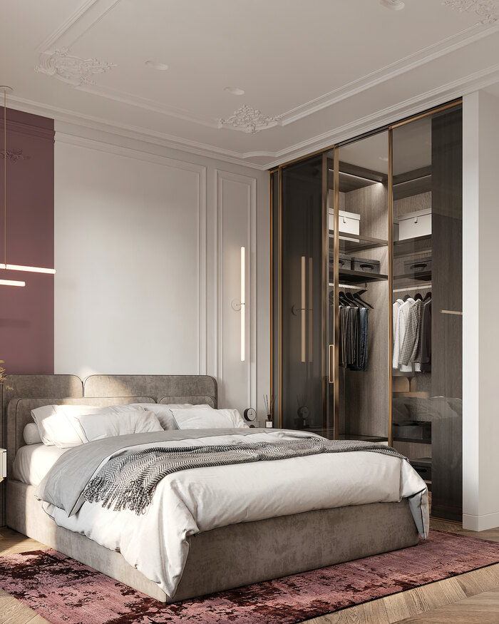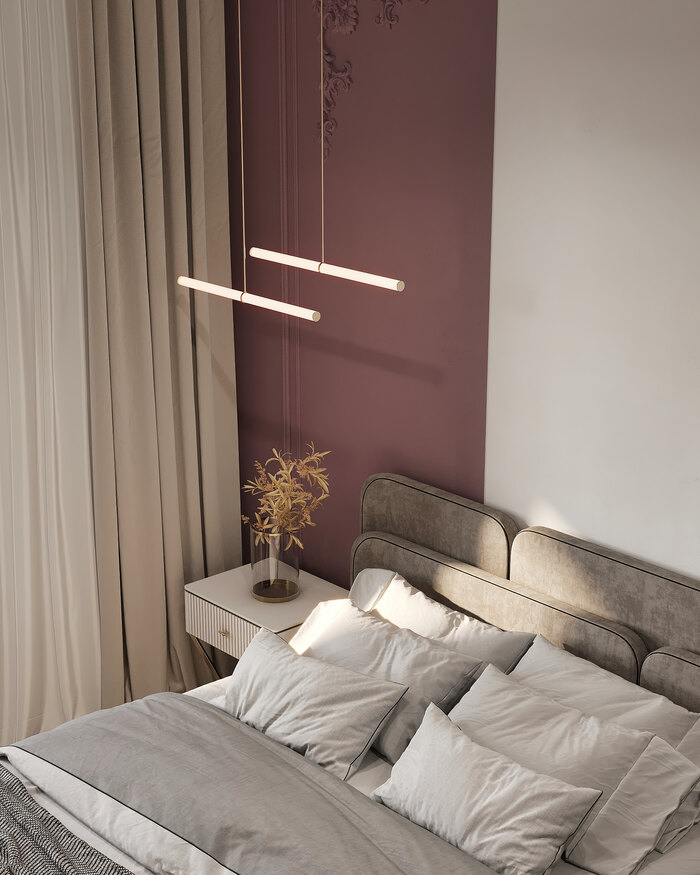 Кровать расположена в центре комнаты, оставляя свободные проходы по обе стороны. У изголовья — прикроватные тумбы и светильники для вечернего чтения. Напротив кровати разместили панно, выполненное художником на заказ. Оно объединяет основные цвета интерьера — лиловый, терракотовый и серо-бежевый, связывая воедино весь проект. Планировка получилась простой и удобной: есть место для хранения повседневных вещей, для отдыха и для вечернего досуга.