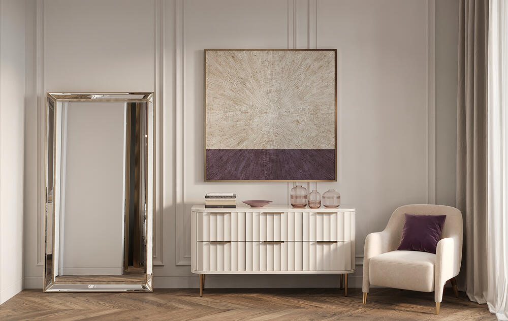 Сочетание тёплого и холодного — серо-бежевые стены, в которых присутствуют оба оттенка, создают особую глубину. На их фоне выделяются контрастные геометрические формы и декоративные элементы.