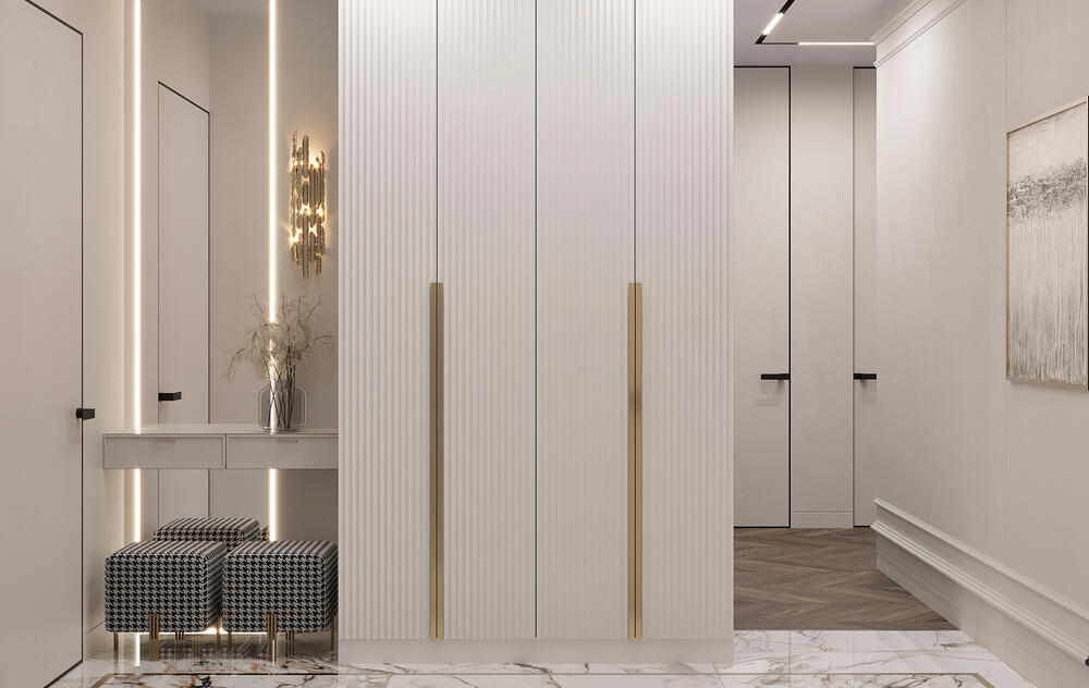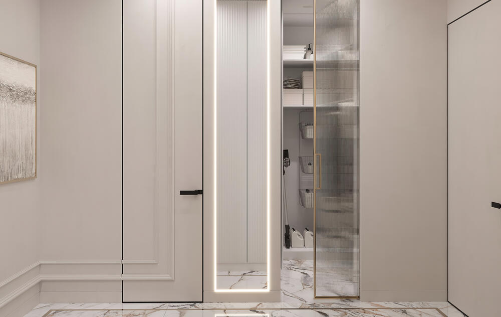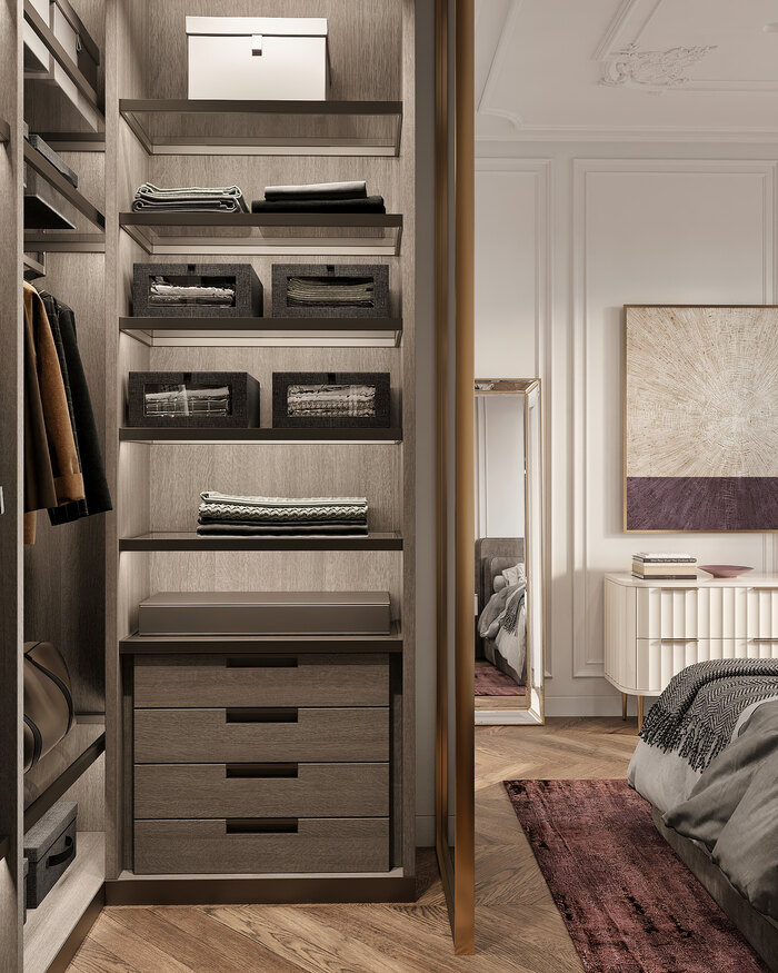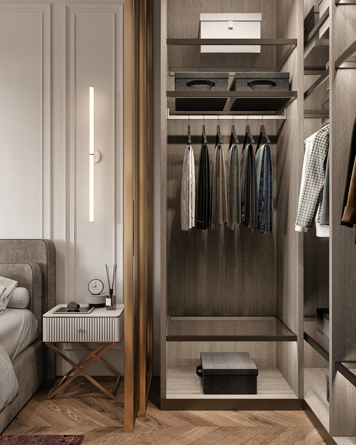 Теперь у хозяев есть место, где каждая вещь на своём месте, а сама гардеробная стала эффектным интерьерным элементом, подчёркивающим стиль всей квартиры.