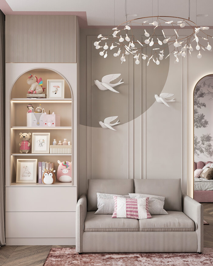 Комната спланирована так, чтобы оставалось достаточно места для игр в центре. Все предметы хранения расположены вдоль стен, поэтому пространство остаётся свободным и лёгким.