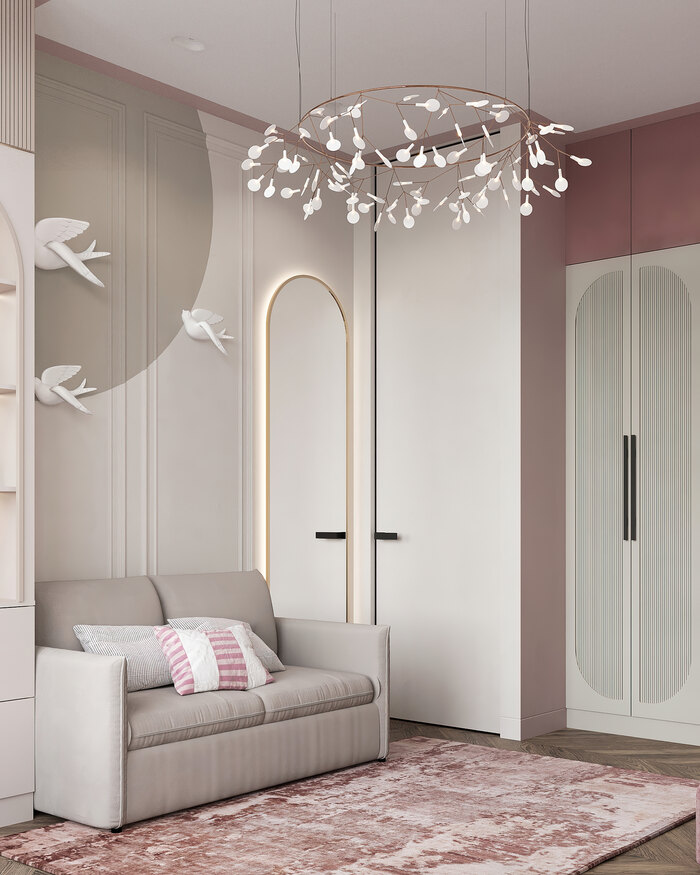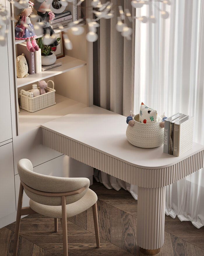 Такое решение особенно ценно для семьи: днём это тихое место для сосредоточенности, а вечером — уголок, где можно спокойно почитать или провести время наедине.