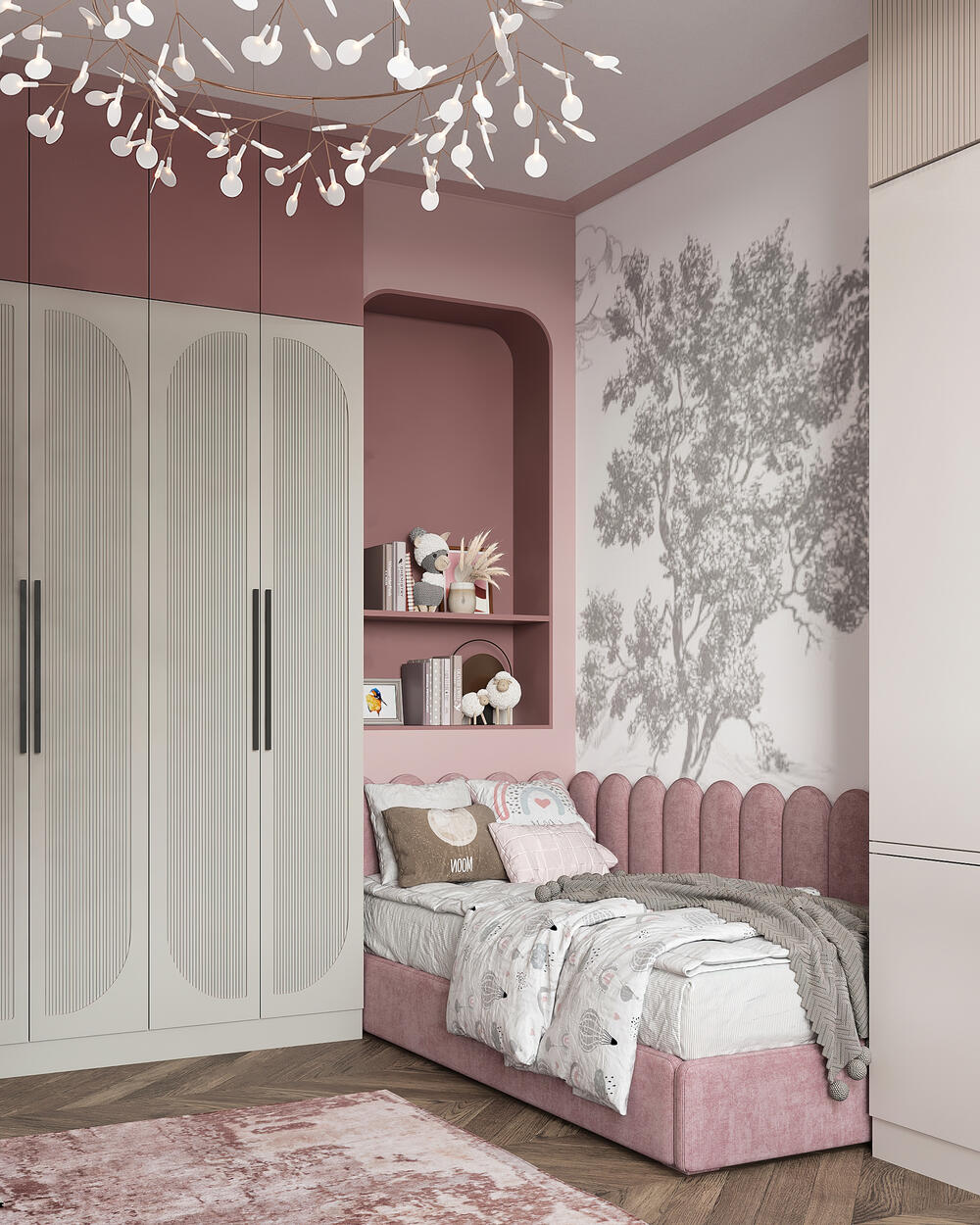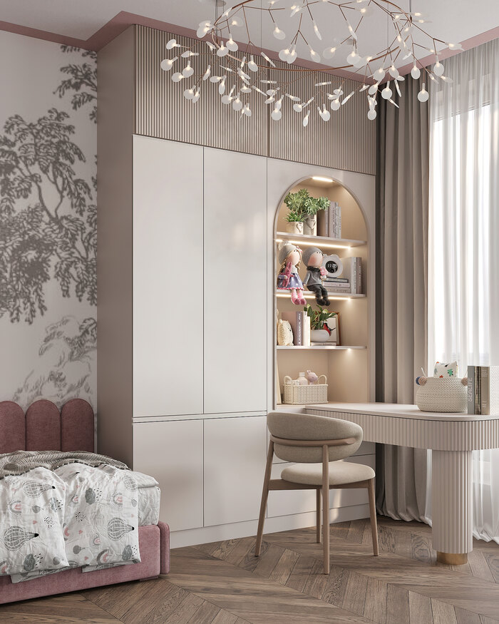 Детскую сделали максимально удобной и функциональной для ребёнка. Здесь есть спальное место, шкаф для одежды и открытые полки для игрушек и книг. Рабочая зона у окна позволяет заниматься и рисовать при хорошем естественном свете.
