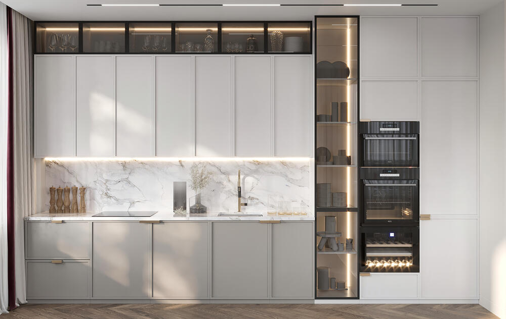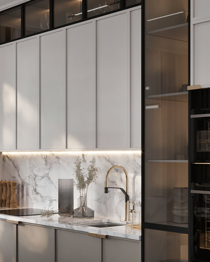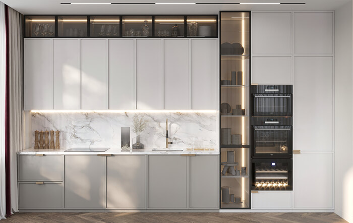 Стекло (тонированное и прозрачное) — применено в фасадах шкафов, перегородках и винном шкафе. Оно делает пространство легким и современным, добавляет глубины, а в быту дает удобство: видно всё содержимое, легко найти нужную вещь, при этом стекло не утяжеляет пространство
