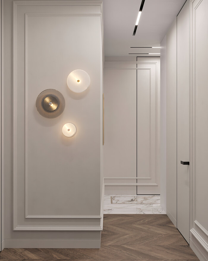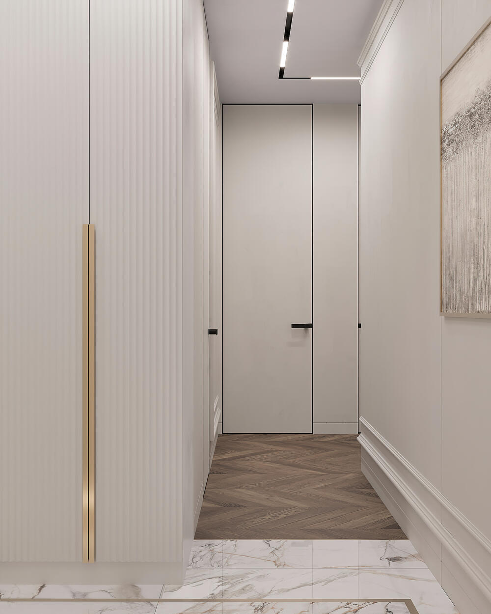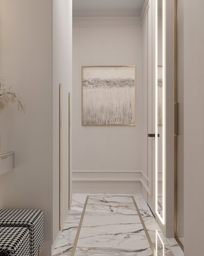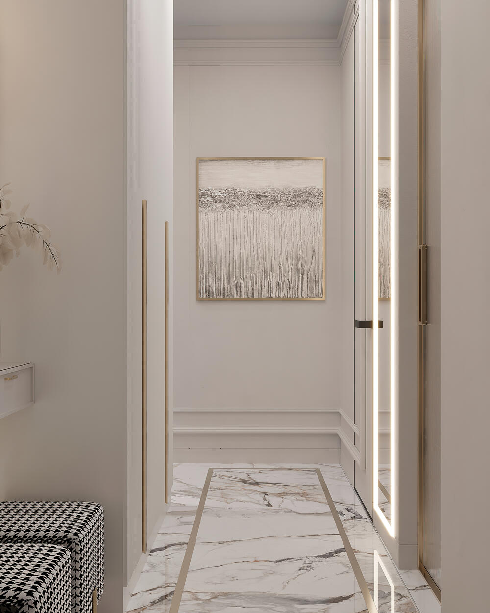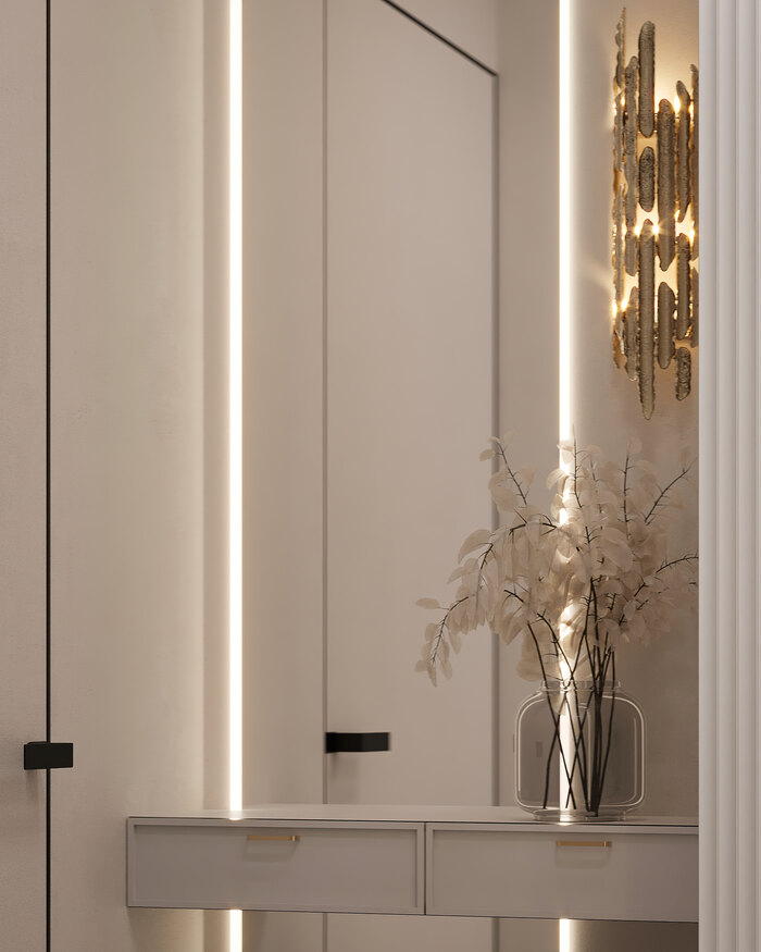 Изначально холл был слишком длинным и неудобным, поэтому мы разделили его на две части: входную и жилую. В зоне прихожей разместили встроенный шкаф для верхней одежды и обуви, а также консоль у входа — удобно положить ключи или сумку.