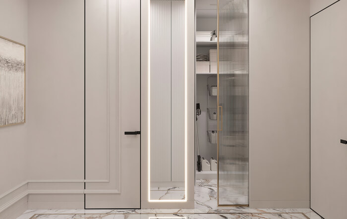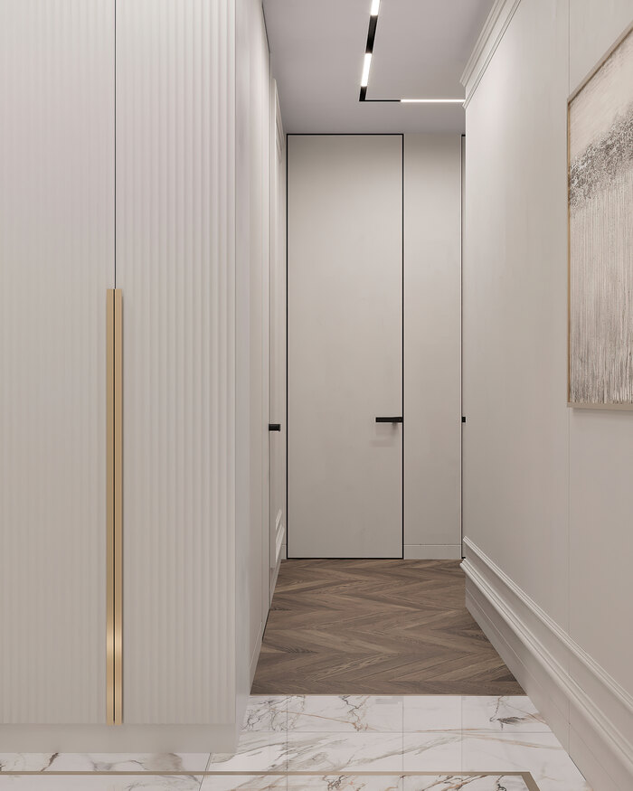 Гардеробная рядом позволяет хранить сезонные вещи и не загромождать прихожую шкафами. Благодаря этому пространство получилось аккуратным и функциональным: при входе всё под рукой, а коридор остаётся светлым и просторным.