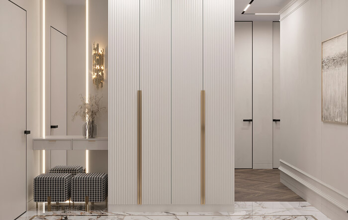 Вместительный гардероб — одна из самых важных задач в проекте. Мы выделили для него отдельную зону за счёт перепланировки холла. В результате получилось пространство, где всё продумано: от секций для длинной одежды до компактных полок для обуви и аксессуаров.