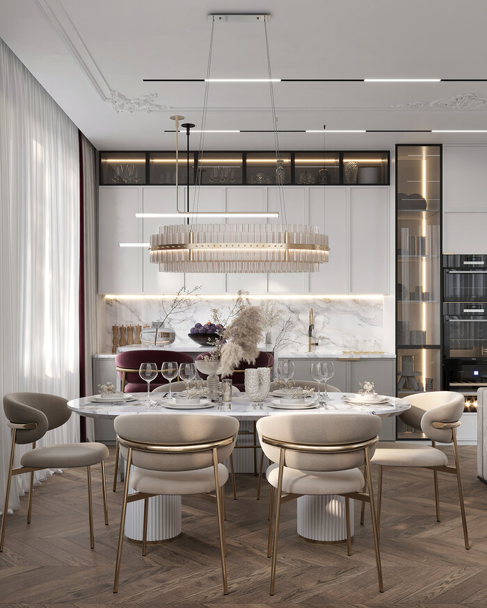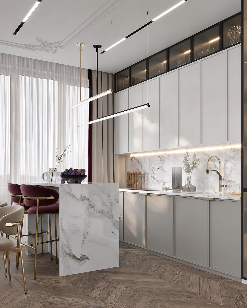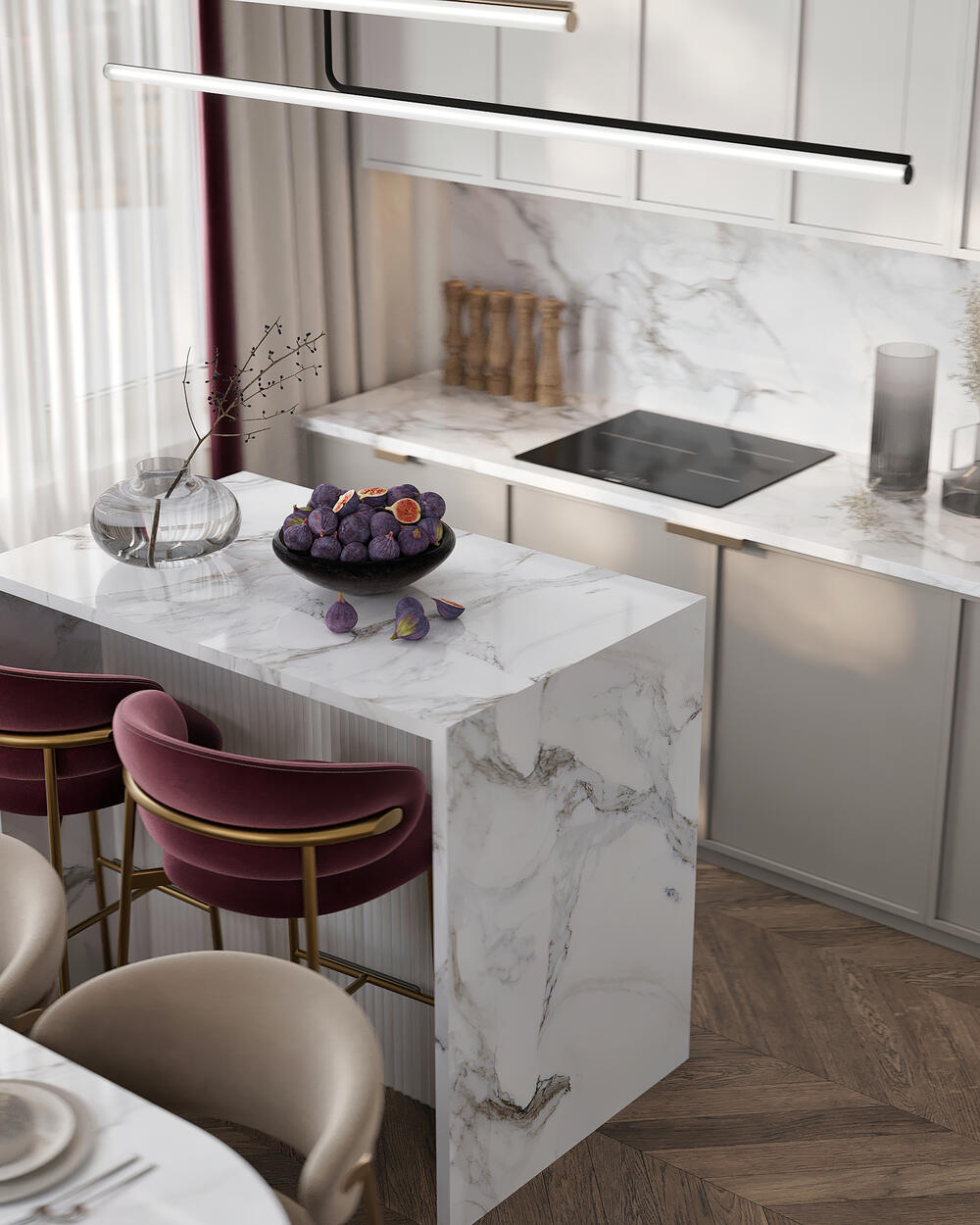 Пространство продумано так, чтобы все зоны находились в шаговой доступности, а проходы оставались свободными. Здесь можно быстро приготовить еду, выпить утренний кофе у острова или устроить вечер с бокалом вина — кухня получилась стильной, удобной и функциональной.