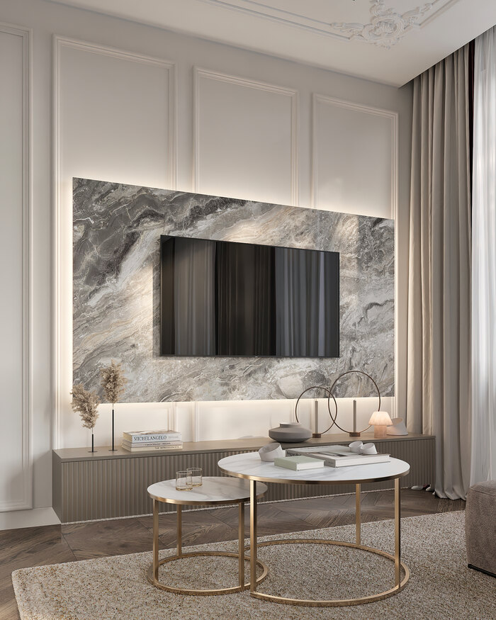 Главным акцентом гостиной стала панель из натурального камня за телевизором. Мы предусмотрели скрытые закладные и подсветку, благодаря чему панель смотрится объёмно и эффектно, особенно на фоне декоративных молдингов. Это решение соединяет классику и современность, делая пространство изысканным.