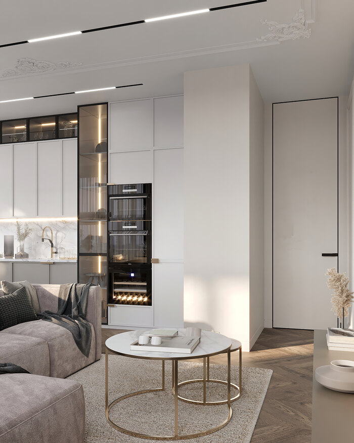 Интерьер квартиры в ЖК «Приоритет» стал гармоничным воплощением современного стиля с элементами ар-деко. Все задачи, которые поставили заказчики, были реализованы: появились межкомнатные двери до потолка, акцентная панель из натурального камня за телевизором, винный шкаф с тонированным стеклом, а также остров в кухне-гостиной, несмотря на компактную площадь.