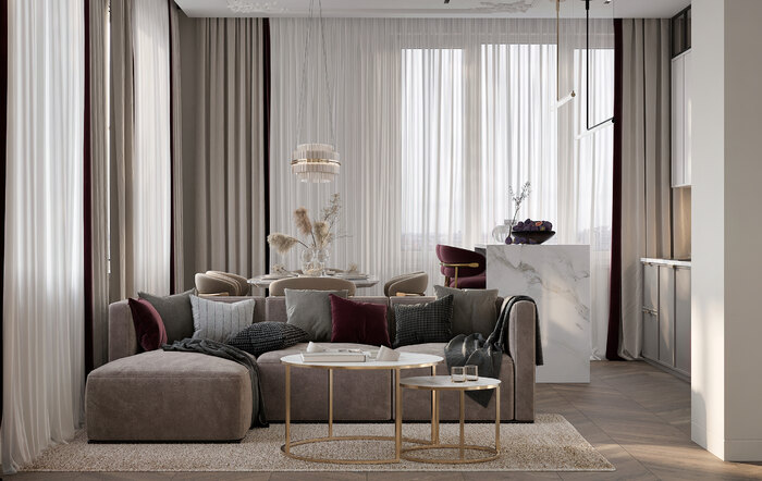 Интерьер выполнен в современном стиле с элементами ар-деко. В основе — спокойные пастельные оттенки, которые создают легкий фон для жизни. Для акцентов мы использовали сочетание лилового и терракотового, а также серо-бежевые краски, в которых есть и теплые, и холодные полутона.