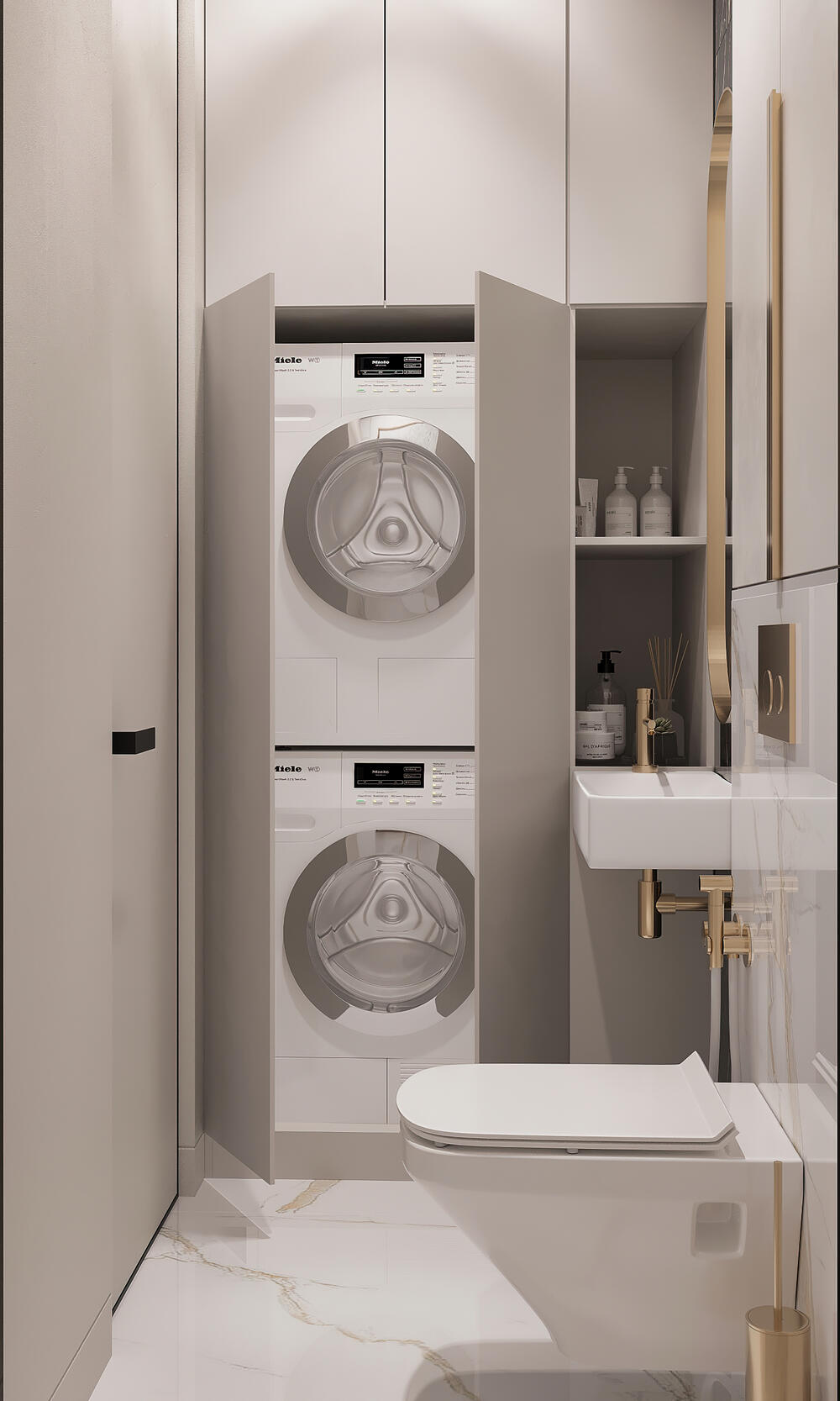 На площади всего 2 м² удалось разместить полноценный санузел и постирочную. Встроенные шкафы до потолка скрывают стиральную и сушильную машины, а также средства для уборки. Благодаря этому пространство выглядит аккуратно и не перегружено.
