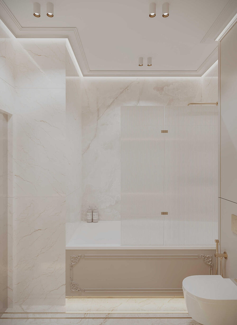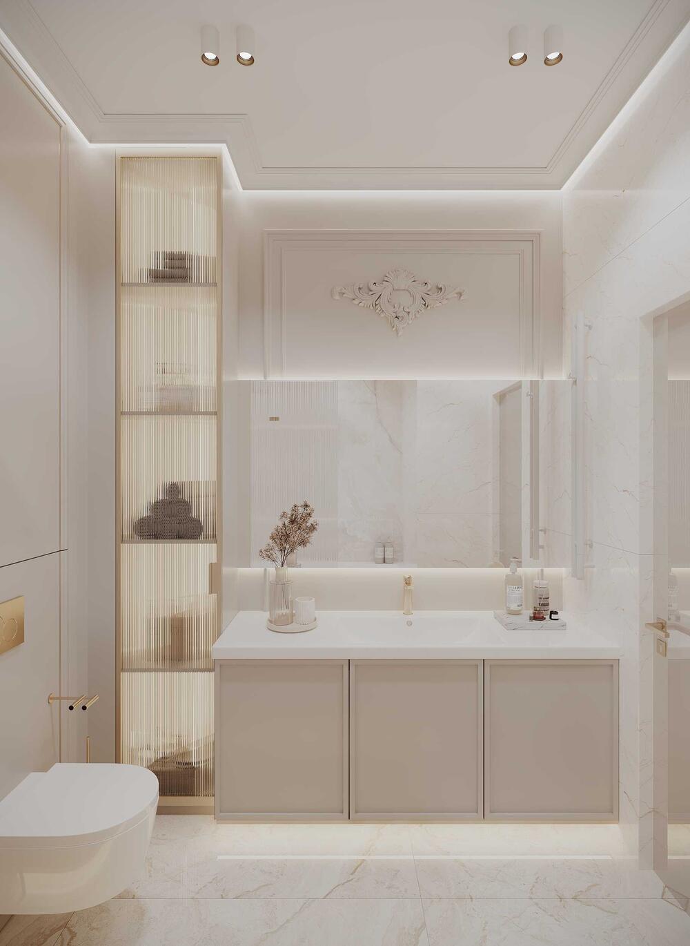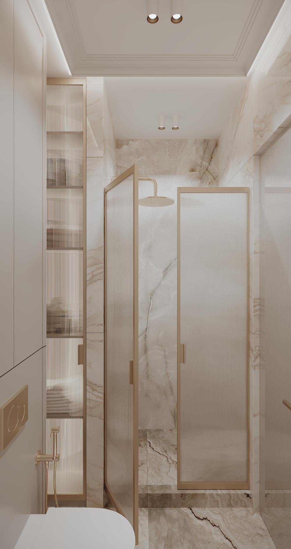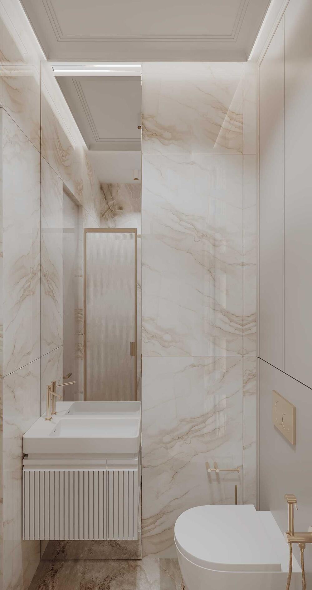 Дополнительно разместили узкий витринный шкаф с рифлёными стеклянными дверцами и встроенный стеллаж для хранения. Отделка — светлый керамогранит под мрамор, фурнитура — латунь.