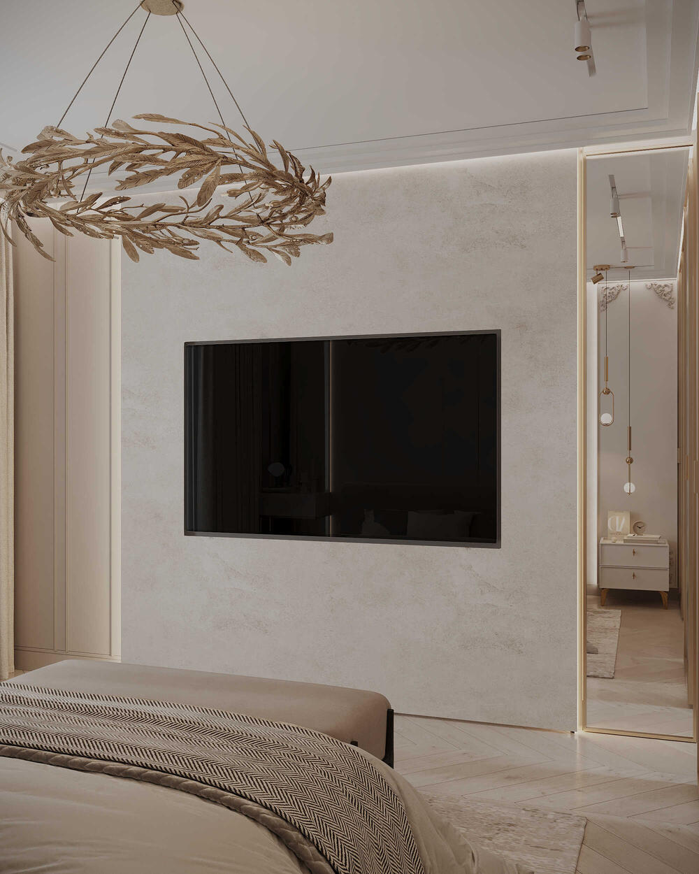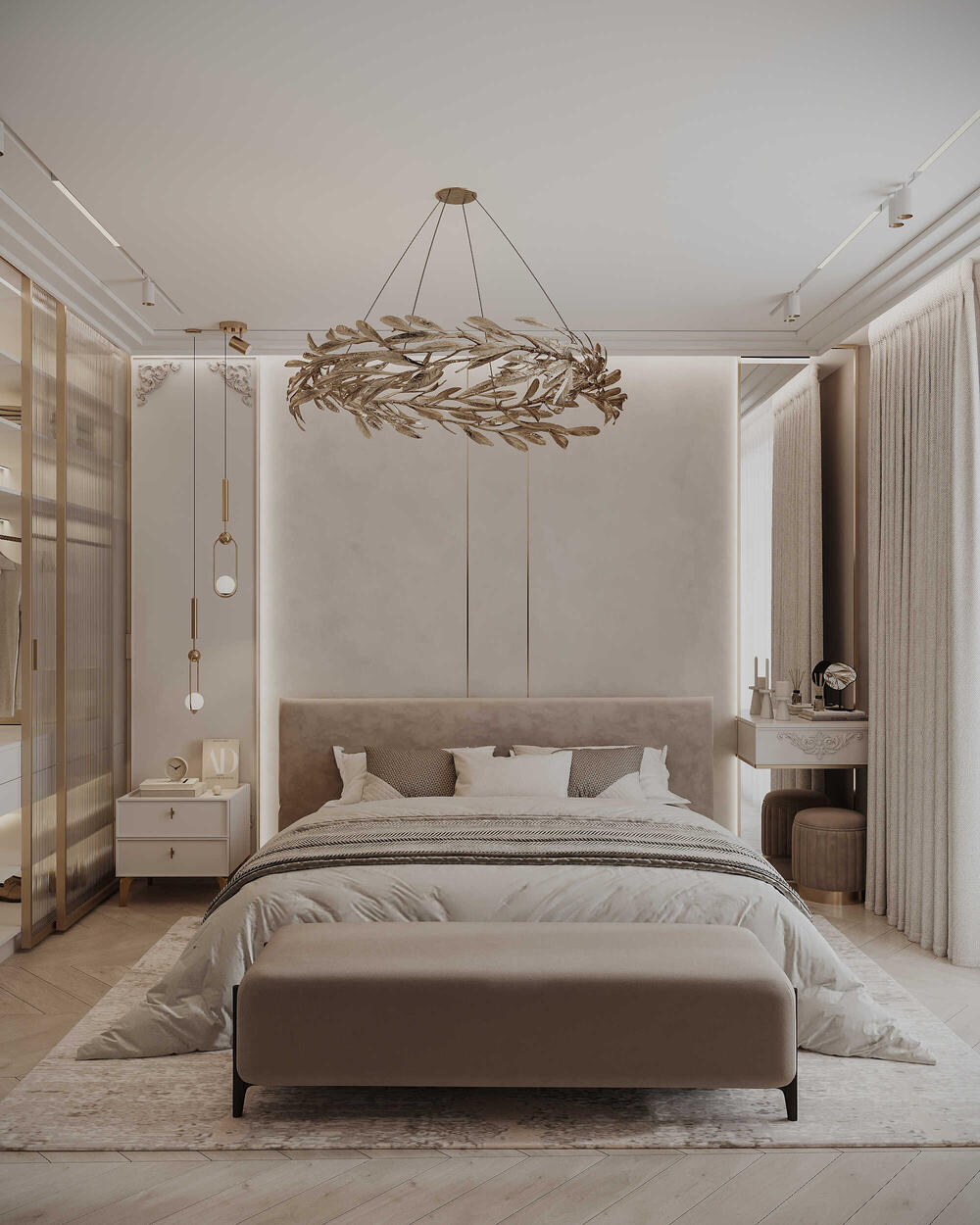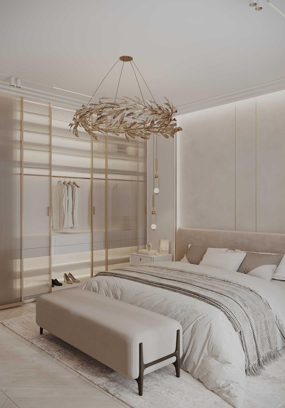 Чтобы сохранить тишину и свет, спальню отделили от технической зоны стеклянной перегородкой. Она приглушает звуки, но не «отрезает» дневной свет. Атмосфера спальни выстроена на нюансах: мягкие карамельные оттенки, спокойные текстуры, обивка из замши на изголовье кровати, лёгкое декоративное панно и люстра с латунными листьями. У окна — туалетный столик с лаконичным зеркалом и мягким пуфом. Всё пространство продумано так, чтобы ничто не отвлекало от отдыха.