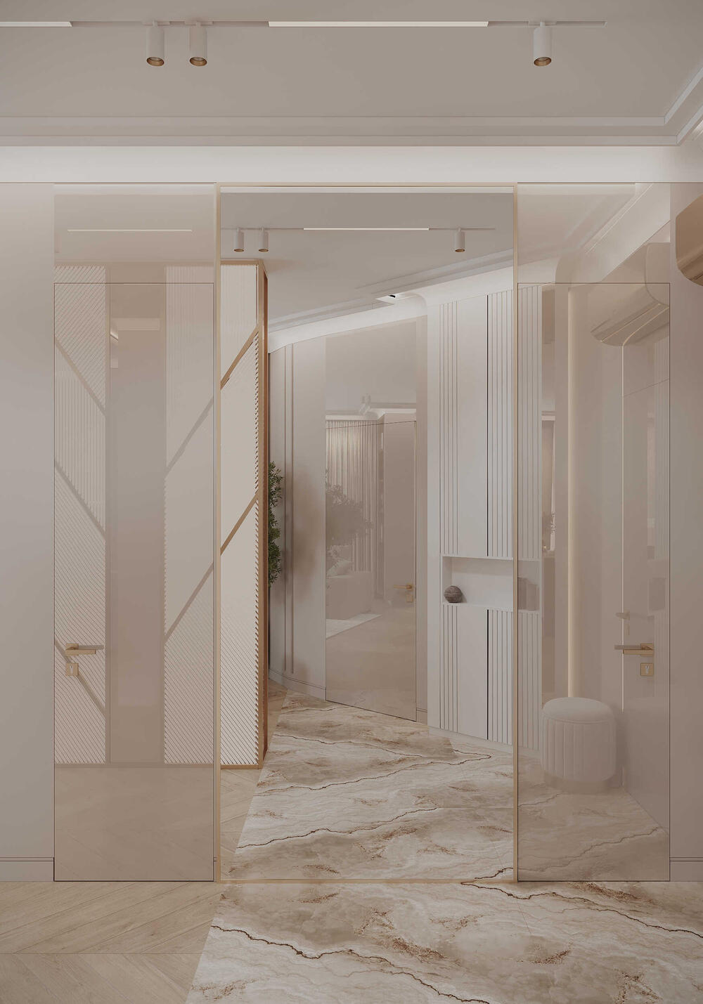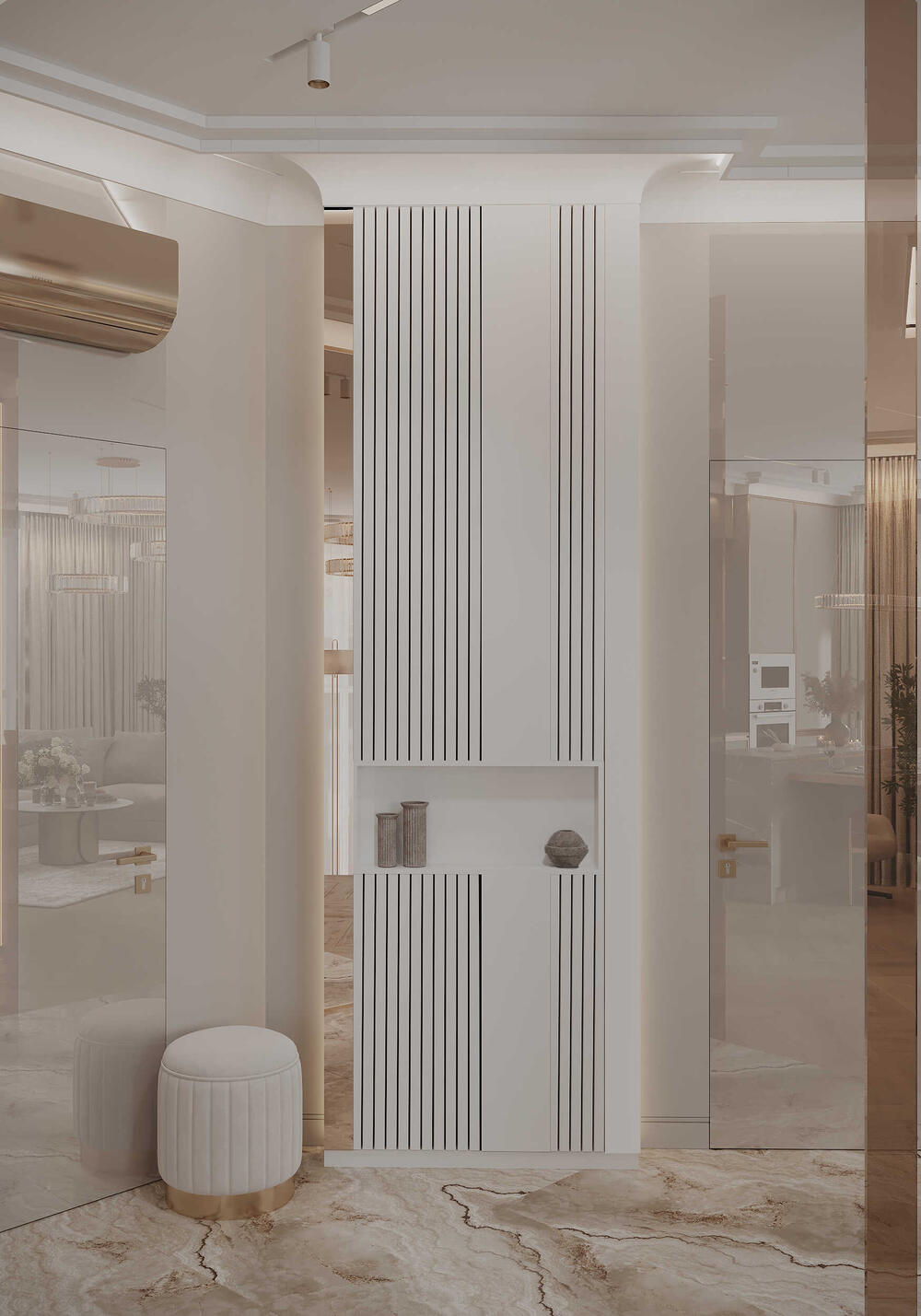 Ставка сделана на невидимые системы хранения — это было важным пунктом для заказчика. Встроенные шкафы, скрытая ключница, высокий гардероб и антресольный блок решают вопрос хранения с минимальным визуальным следом. Колонна у входа оформлена стеклом и зеркальными вставками с латунными деталями, что делает её почти незаметной.